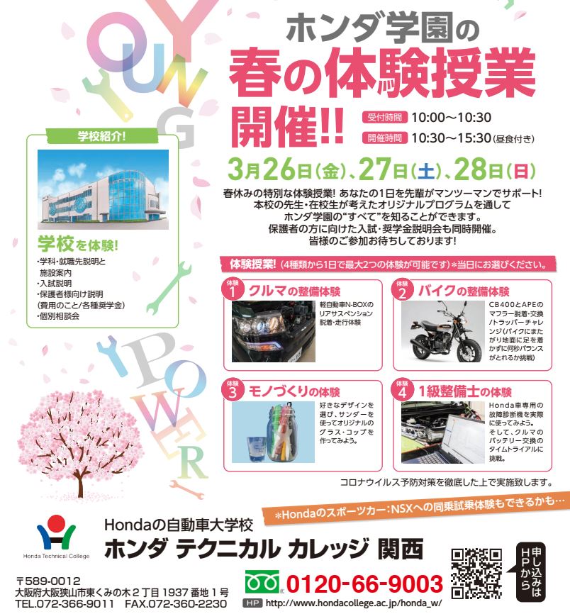 3月26日(金)~28日(日)の3日間で実施するホンダ学園関西校の『体験授業』。学園の先生が考えたオリジナル体験メニューに在校生も参加者様のサポートに加わり、学園のことが知れて、体験ができて、楽しさMAXの一日に間違いなし。