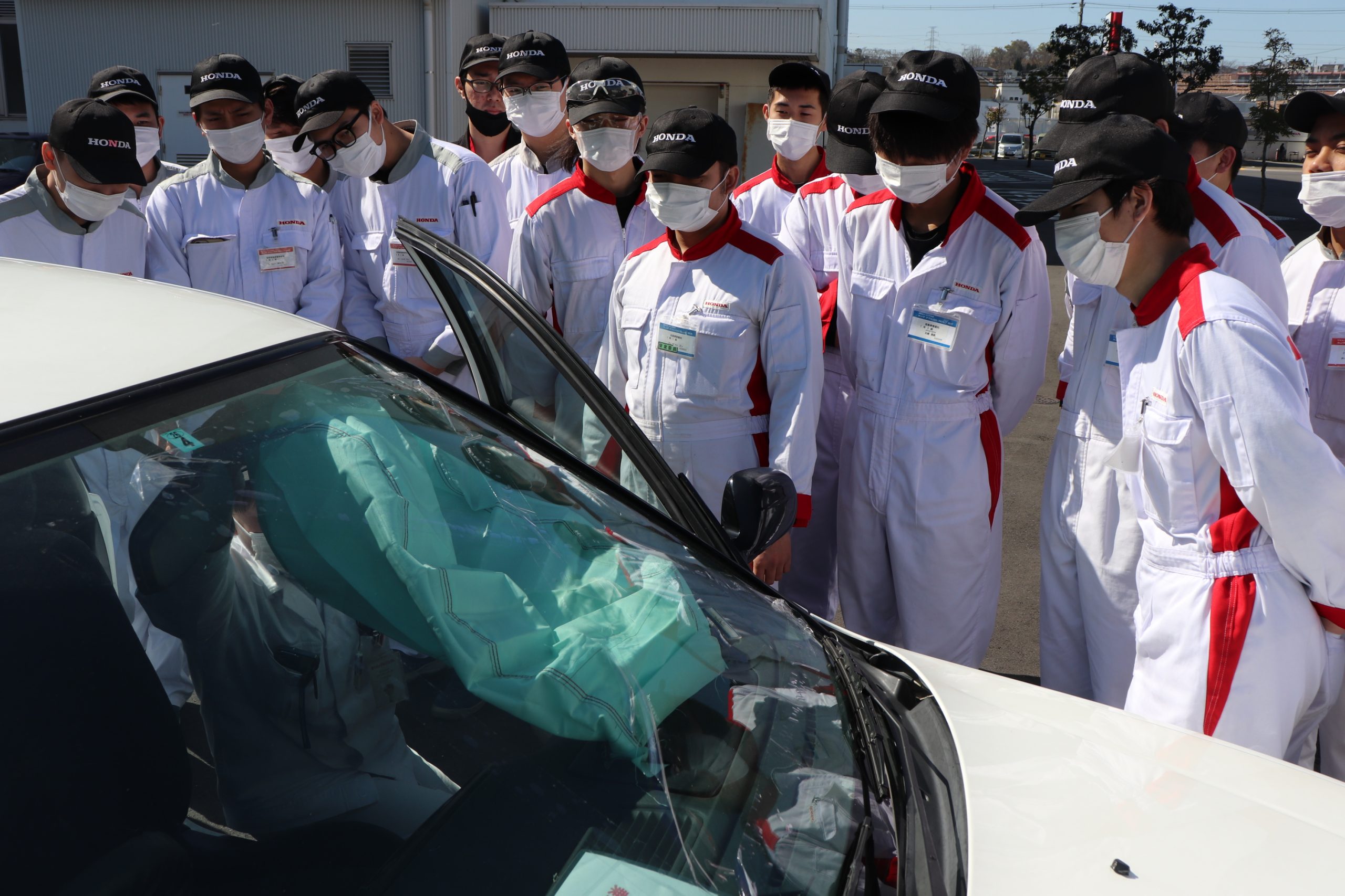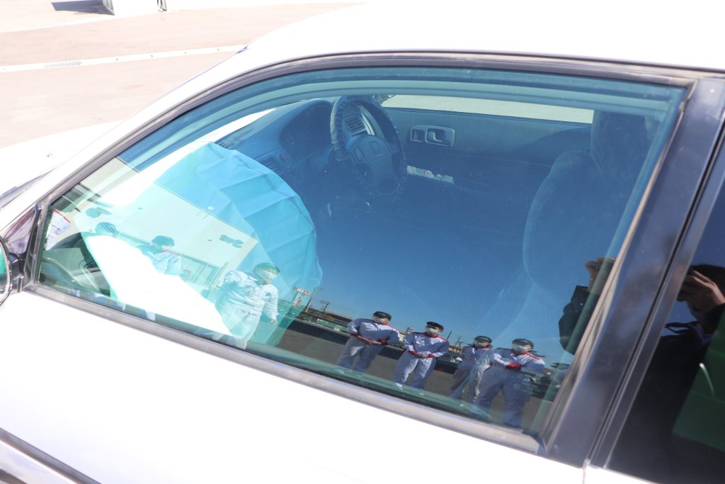 先日、実習車として廃棄になる車両を使い、なかなかできない体験授業①エアバッグの展開と➁緊急脱出時の車両ガラスの粉砕の体験授業を実施しました。