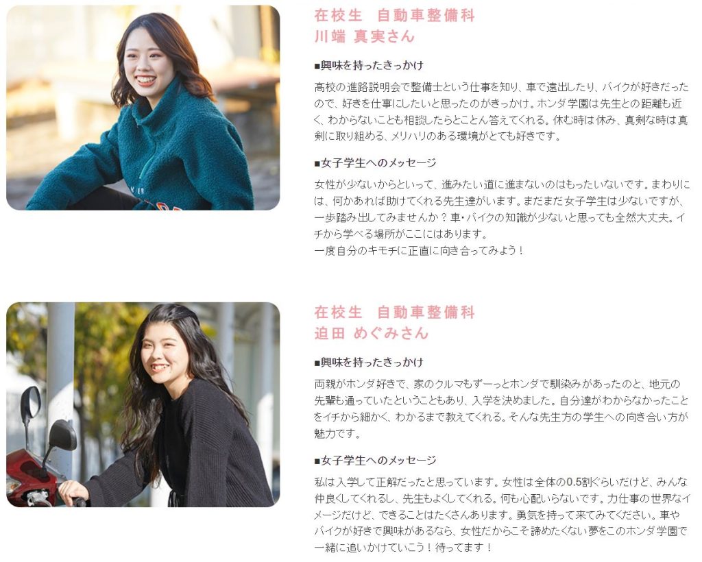 【公開】Girl′s Hondaコーナーに在校生情報追加 2022.01.19 HPの「Girl′s Honda」コーナーに自動車整備科に在籍する女子学生2名を追加掲載しました。好きや興味関心があるとその道に進みたいと思うことに性別は関係ありません。女子学生も自らの夢や目標に向かって進んでいます。下図をクリックする「Girl′s Honda」コーナーが立ち上がります。 好き・憧れは興味関心を生み、行動に繋がる。