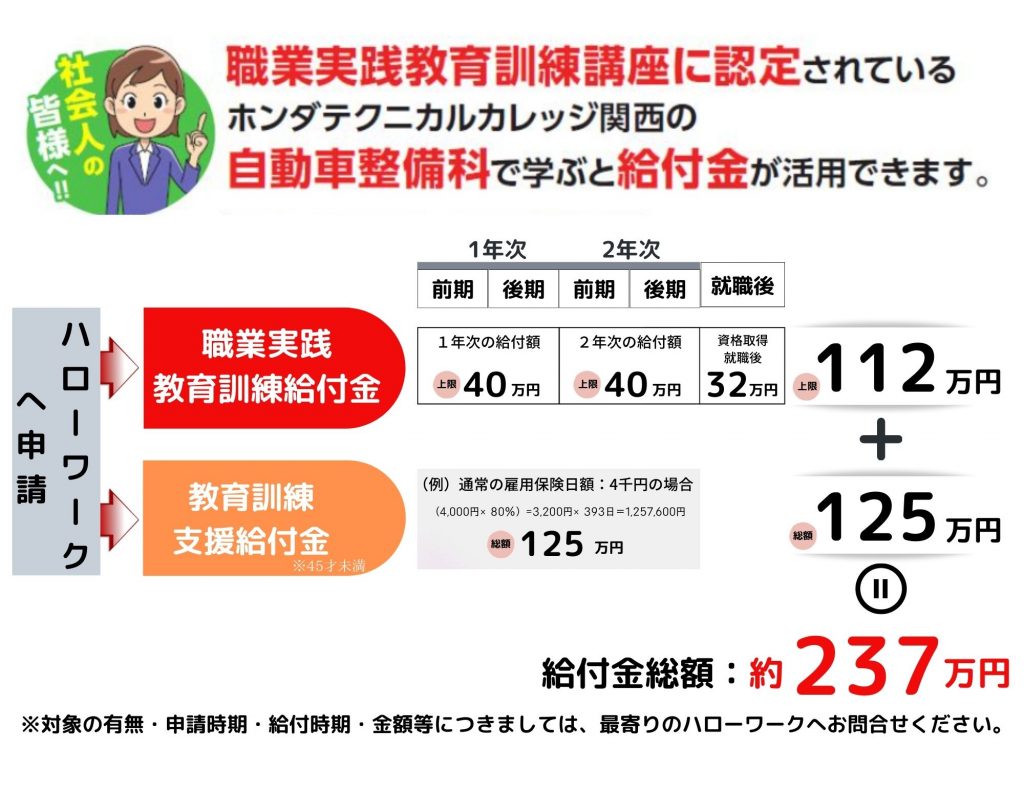 ホンダテクニカルカレッジ関西校の自動車整備科(2年課程)は、厚生労働省より教育訓練給付金の対象となる「専門実践教育給付金指定講座」に再認定されました。社会人の方・社会人だった方の学び直しに、国(ハローワーク)が支援してくれる制度です。自動車業界で活躍してみたい方は、ぜひこの制度を利用してホンダ学園で二級自動車整備士資格を取得しませんか。