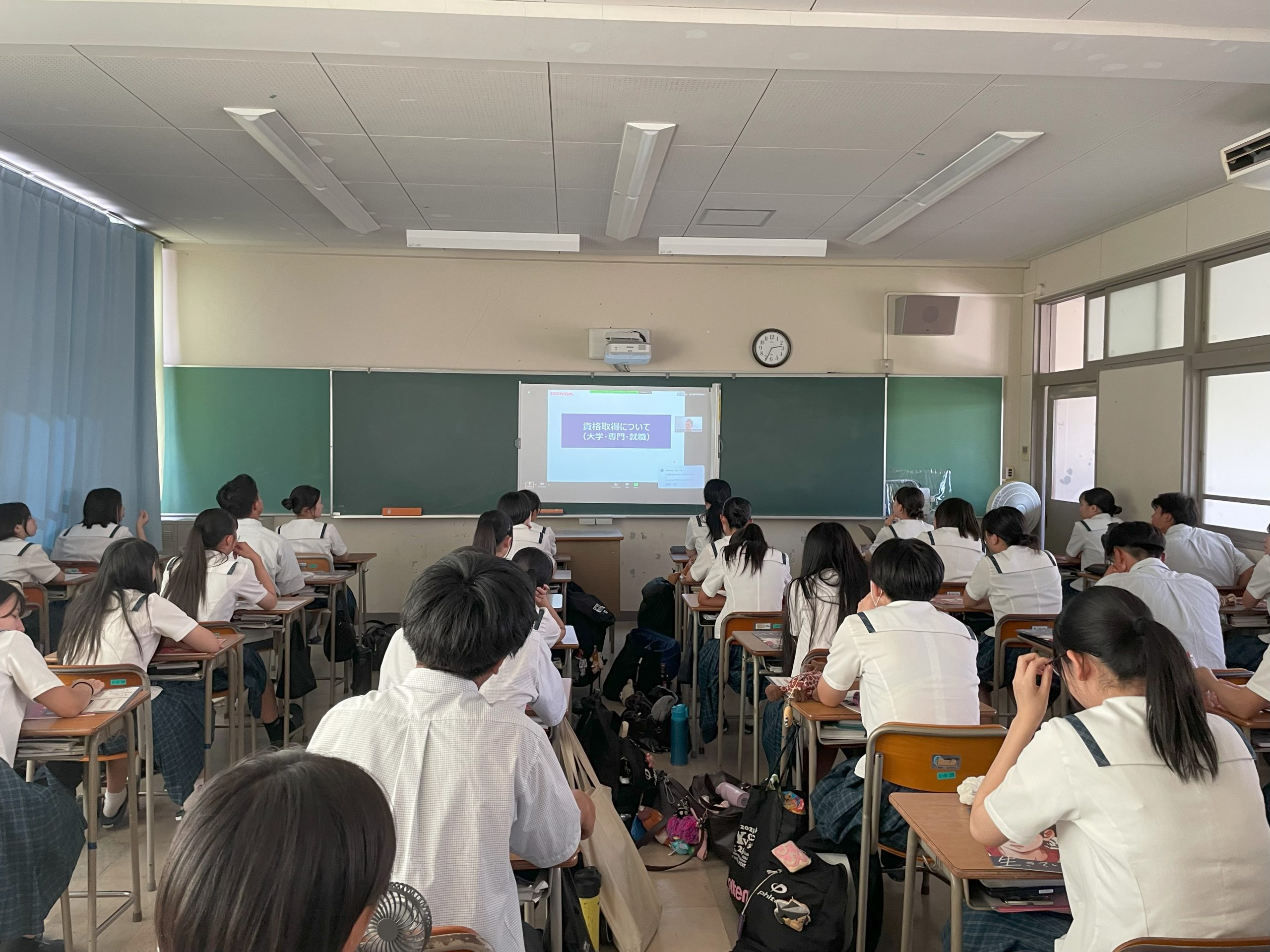 9月18日(水)に三重県の津商業高等学校1年生240名へONLINEで「進路探求授業」を実施させていただきました。モニター越しでの授業の実施でしたが、みなさん配布させていただいた進路探求ノートにメモを取って、しっかり授業を受けてくださいました。ぜひ、未来から今を考えていく「バックキャスト思考(逆算思考)」を使って、ご自身のやりたいことを考えてみてください。「好きなこと」×「得意なこと」×「価値観(大切に)していること」=本当にやりたいことを見つけてくださいね!