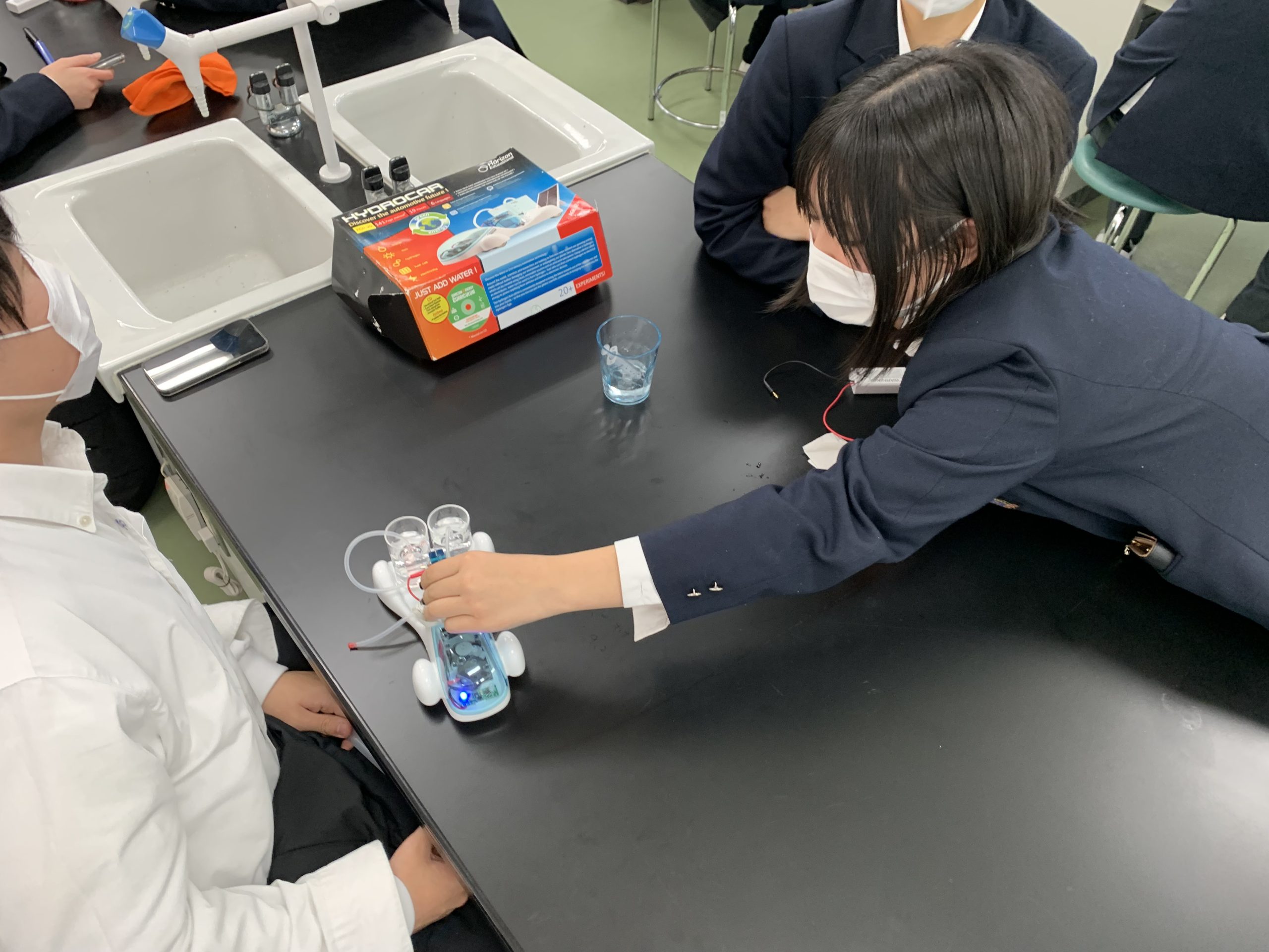 1月16日(月)と19日(木)の二日間で、和歌山東高等学校1年生への出張授業『次世代エネルギー"水素"を使って模型のクルマを走らせる』を実施させて頂きました。実際に自ら電気分解で水から水素を取り出し、更に酸素と化合させてその過程でイオン電子を発生させ、そのイオン電子=電気で模型のクルマを動かしてみるといつも生徒たちは驚きます。今回も。。。そうでした。(^^♪