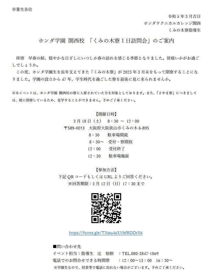〇「ホンダ学園 関西校 くみの木寮 閉寮イベント」