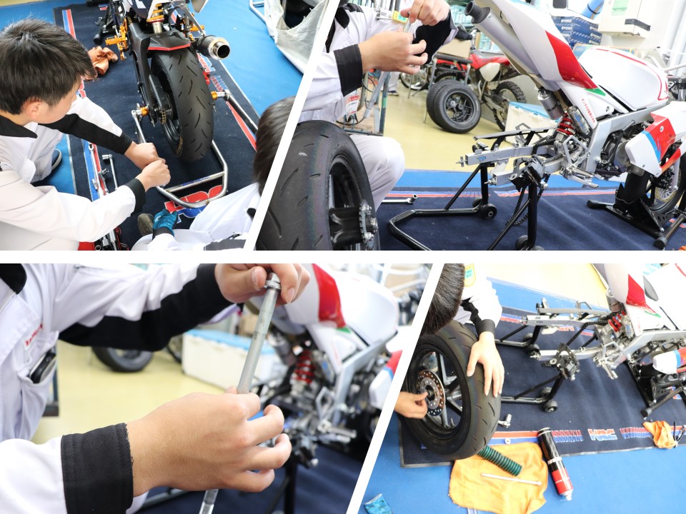二輪整備同好会では、現在、レース車両、「NSF100」と「HRC GROM」のスポーツ走行(サーキット走行)前の点検・整備を 行っています。