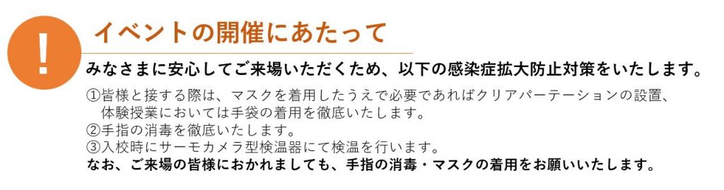 *コロナ感染対策は徹底して、オープンキャンパスを開催いたします。ご参加される皆様におかれましても、感染予防対策(マスク着用・消毒・検温)にご協力をお願いいたします。