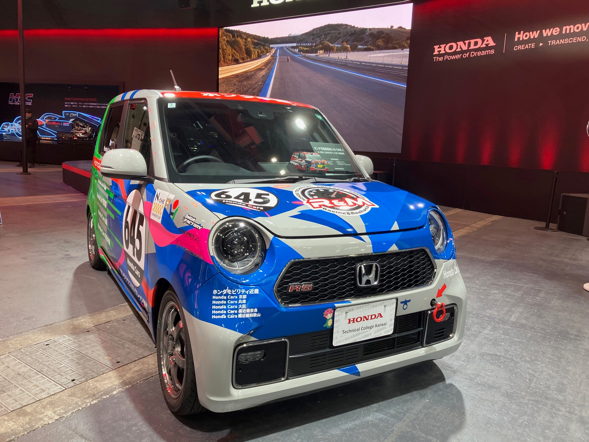2月7日~9日にインテックス大阪にて開催された『大阪オートメッセ2025(通称OAM)』のHondaブースで、本校のHTEC R&M部のN-ONE OWER’S CUP参戦車両を展示をしました。説明員は学園生が担い、多くの来場者様への説明を実施させていただきました。