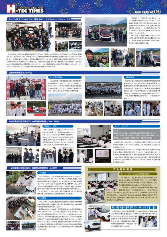 【学園新聞】H-TEC TIMES 2023年夏号の発行 2023.09.05 ホンダテクニカルカレッジ関西の学園新聞(2023年夏号Vol.108)が出来上がりました。今回は、4月の入学式、鈴鹿サーキットでの校外オリエンテーションの他、同好会活動やインターンシップ、授業等、盛りだくさんです。ぜひ、ご覧ください。 「好き」は未来に繋がっていくはずだから。