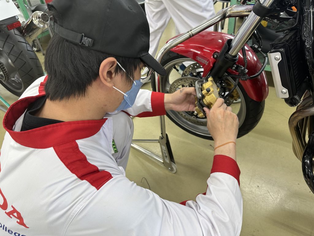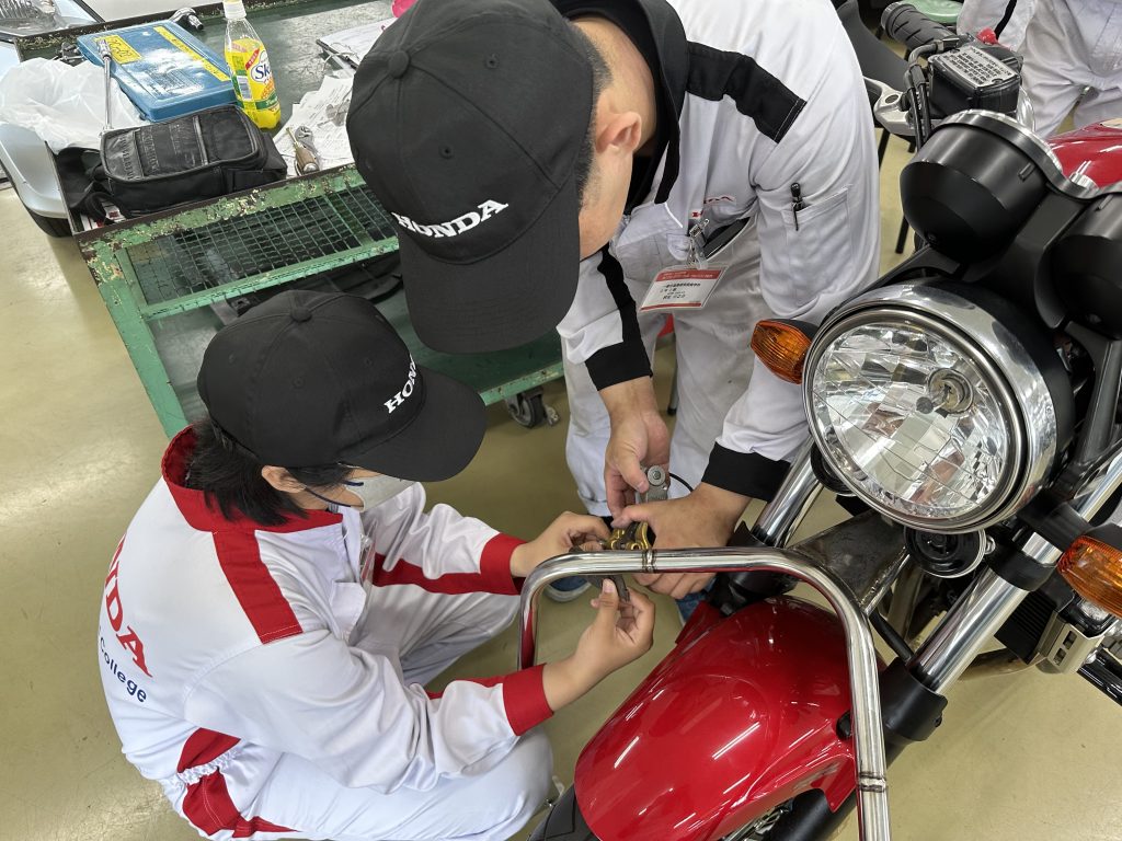 6月22日(木)に自動車整備科と一級自動車研究開発学科の2年生が、今年度から授業に追加した『二輪車の12ヵ月点検』を実践形式で実施しました。まずは、12ヵ月点検で使用する整備記録簿の記入方法を再確認し、教材車のCB400を使って12ヵ月点検を実施しました。点検終了後は、お客様役の学園生・教職員に整備内容を分かりやすく・丁寧に説明しました。