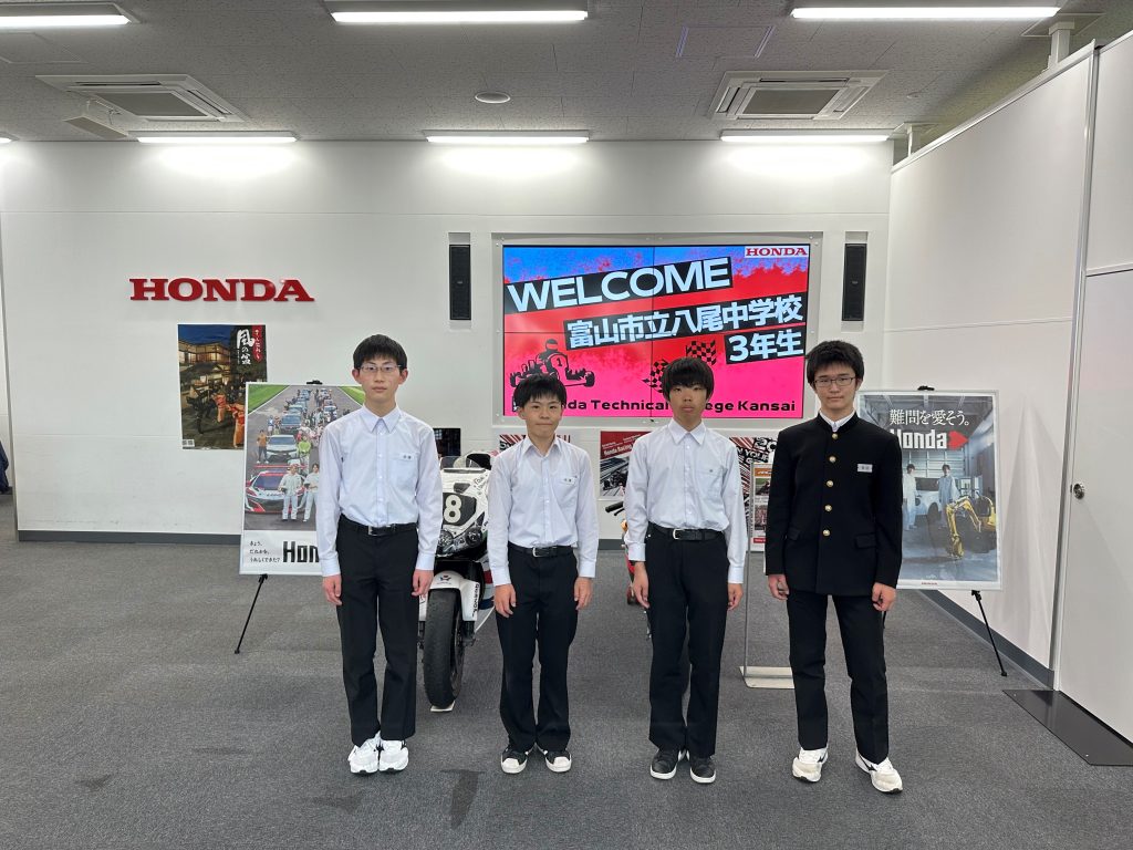 富山県の八尾中学校3年生4名の生徒が、西日本への修学旅行中に、社会見学として本校に訪れてくれました。当日は、学校説明に施設案内・授業見学を実施しました。また、綺麗な生花をいただき、早速、受付に飾らさせていただきました。その他にも八尾市の伝統、おわら風の盆のポスターもいただきましたので、HONDAロゴの下にしっかり掲示させていただきました。(#^^#)この度は、ご来校誠にありがとうざいました。