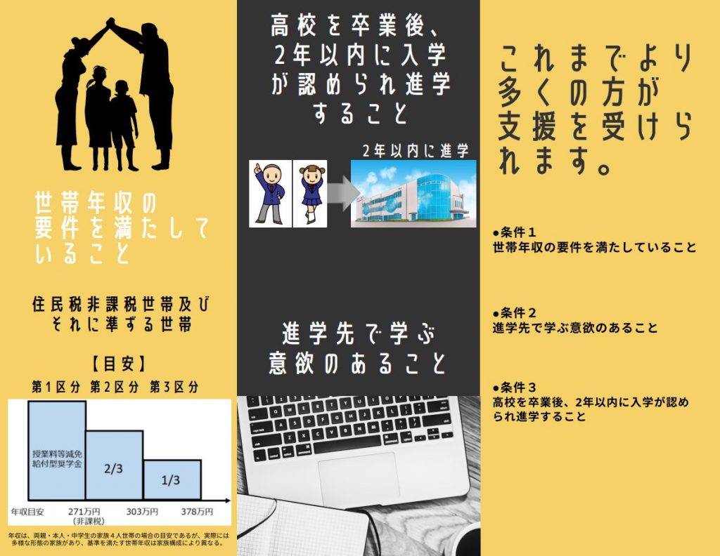 しっかりとした進路への意識や進学意欲があれば、家庭の経済状況に関わらず、「大学、短期大学、高等専門学校、専門学校」に進学できるチャンスを確保できるよう、【入学金減免・授業料減免・給付型奨学金の拡充】といった進学した際の経済的負担を軽減する新制度。
