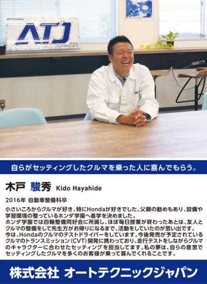 この度、ホンダテクニカルカレッジ関西の自動車整備科を2016年に卒業した後、株式会社オートテクニックジャパンに就職し、Hondaのテストドライバーの仕事に従事している木戸様の記事を追加しました。