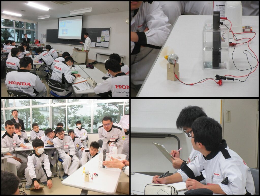 12月18日に一級自動車整備研究科の3年を対象に本田技術研究所 オートモービルセンターの斗ヶ沢さん、本田技研工業 環境安全企画部の鵜飼さんにお越し頂き、水素について講話を頂きました。