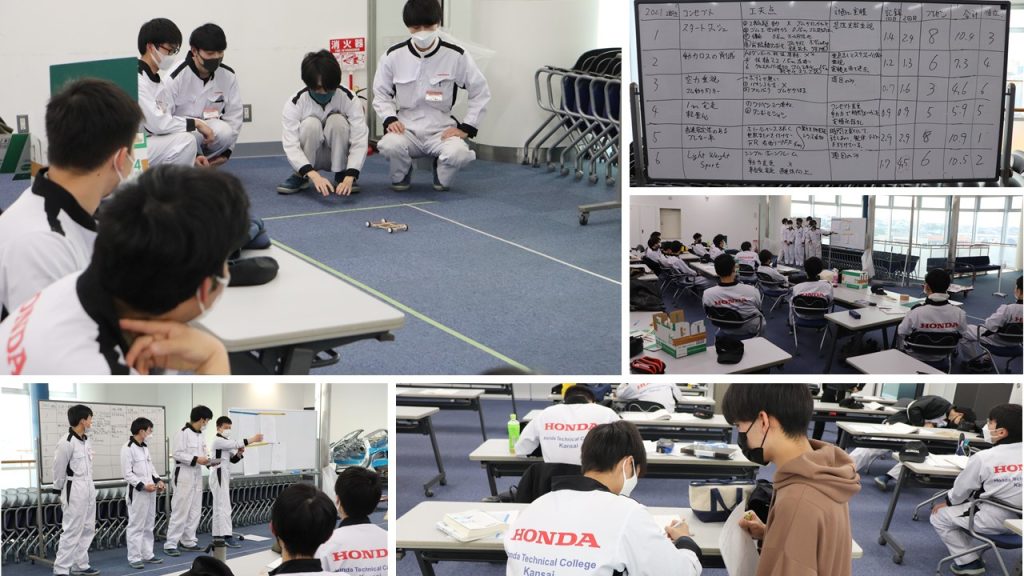 開発コースの授業では、各グループに分かれ、PDCAサイクルで車の開発するときのプロセスを輪ゴムで動く車両製作を通じて学ぶ授業を実施しました。限られた時間の中で、計画・製作・テスト・結果まで導き出すことに大変苦労してました。