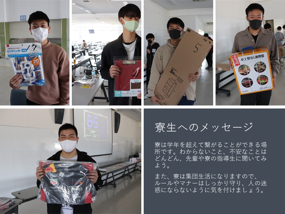 寮は学年を超えた交流ができる場所です。わからないこと、心配なこと、不安なことは、寮の先輩や指導生にどんどん聞いてみよう。また、集団生活ではルールやマナーを一人ひとりがしかっり守ることで、人に迷惑を掛けないこととなります。寮生活でもたくさん学べるものがあります。仲間と共に楽しみ、そして成長していきましょう。