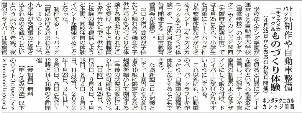 全国の私立学校(幼稚園・小中学校・高等学校・専門・短大・大学)向けに毎月3回発行されている「全私学新聞4月23日発行分」に、本校が4月に開講した小学生向けの『KIDSメカニック&ものづくり教室』を取り上げていただきました。