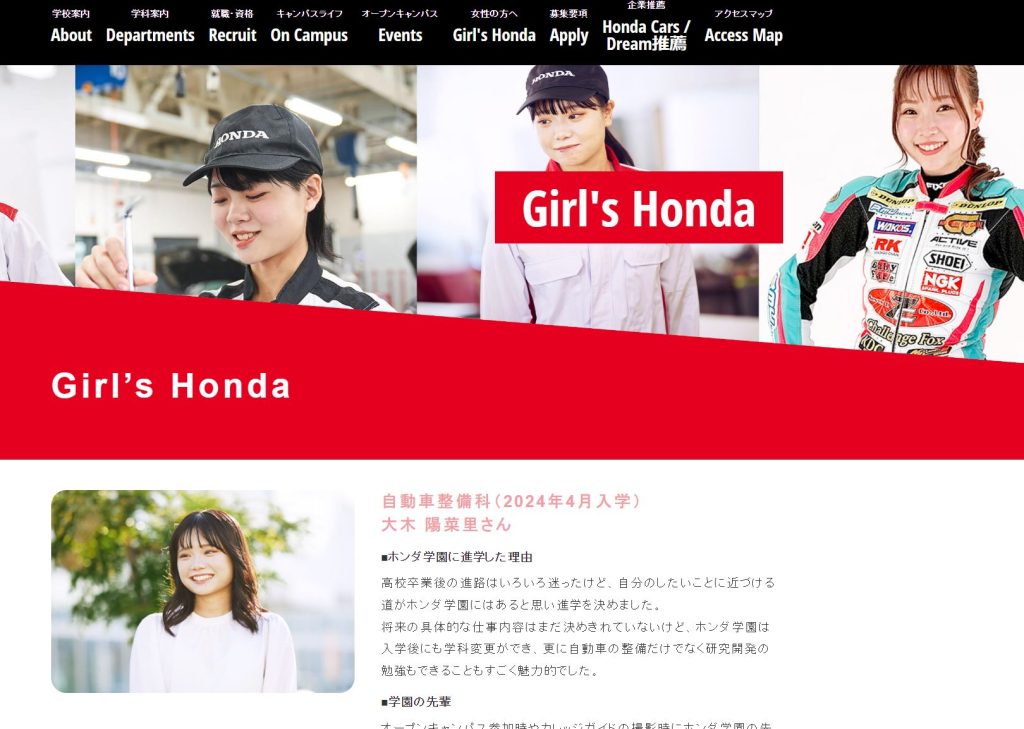 【更新!】学園生の紹介コーナー 2023.12.05 新たに在校生紹介コーナーに学生を3名新規掲載しました。自動車の研究開発者になりたいため、一所懸命頑張っている「一級自動車研究開発学科 自動車研究開発コース」3年生の山元さん、大好きバイクの同好会活動を積極的にしている一級自動車研究開発学科2年生の大塚さん、そして、2024年4月入学予定の大塚さんの3名となります。 ■在校生紹介コーナー(下記画像をクリックすると遷移します) ■Girl’s Hondaコーナー(下記画像をクリックすると遷移します)