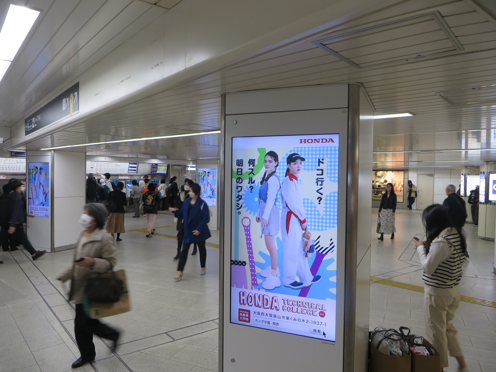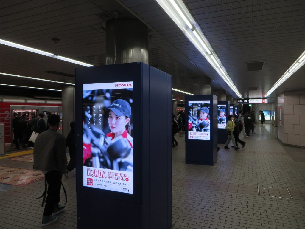 【梅田・なんば 駅de】駅のサイネージを使った動画広告スタート! 2022.11.21 大阪の駅の乗降人数が圧倒的に多い『梅田』と『なんば』の駅(2つの駅の乗降人数は約60万人/日)に設置されているデジタルサイネージで、ホンダテクニカルカレッジ関西の動画を11月21日から12月4日まで放映します。期間中は、駅構内で本校の動画がたくさん流れますので、多くの人が見てくれると思います。(^^♪。 ■梅田となんばの駅構内の様子 世界に歓迎されるエンジニアを育成する。それがホンダ学園の建学の精神です。