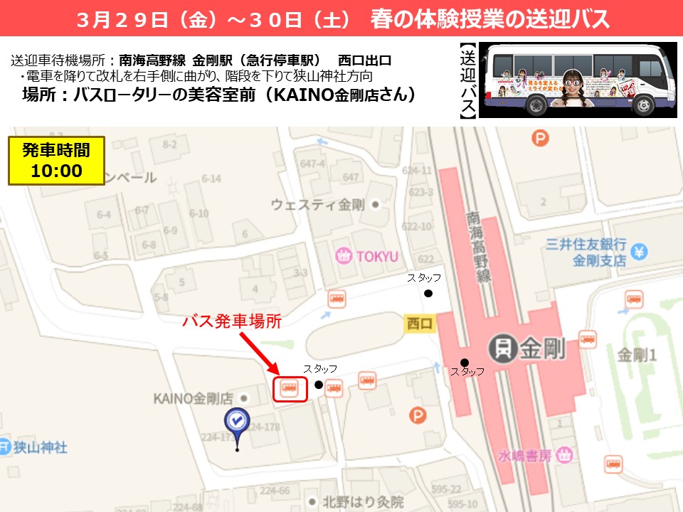 ■学園の最寄り駅:金剛駅から送迎バス出します。金剛駅は急行停車駅で便利!難波から急行で23分(乗車賃:450円)
