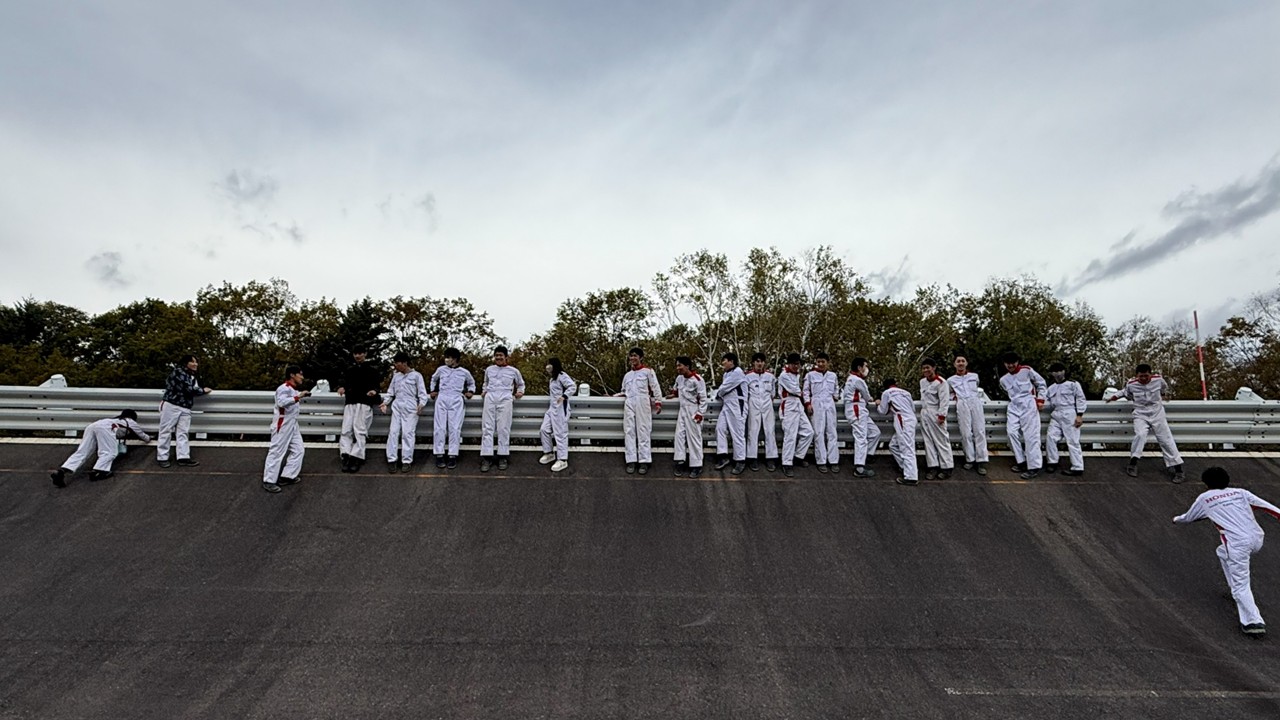 朝のブリーフィングでは学生全員参加で顔合わせを行い、琢磨さんから激励をいただきながら いよいよ走行テスト開始、