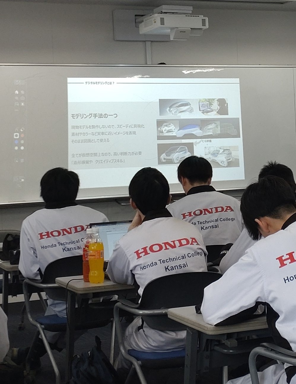 デザイン講話では、Hondaの製品作りにおいて、ゼロからモノをつくる発想が必要なこと、普遍性の追求や革新的なものの創造が必要であったりすること等、とても内容の濃い講義でした。また、クレイ(粘土)を使って、クルマのデザインモデル制作の実演、学園生への指導まで実施していただき、とても充実した実習になりました。