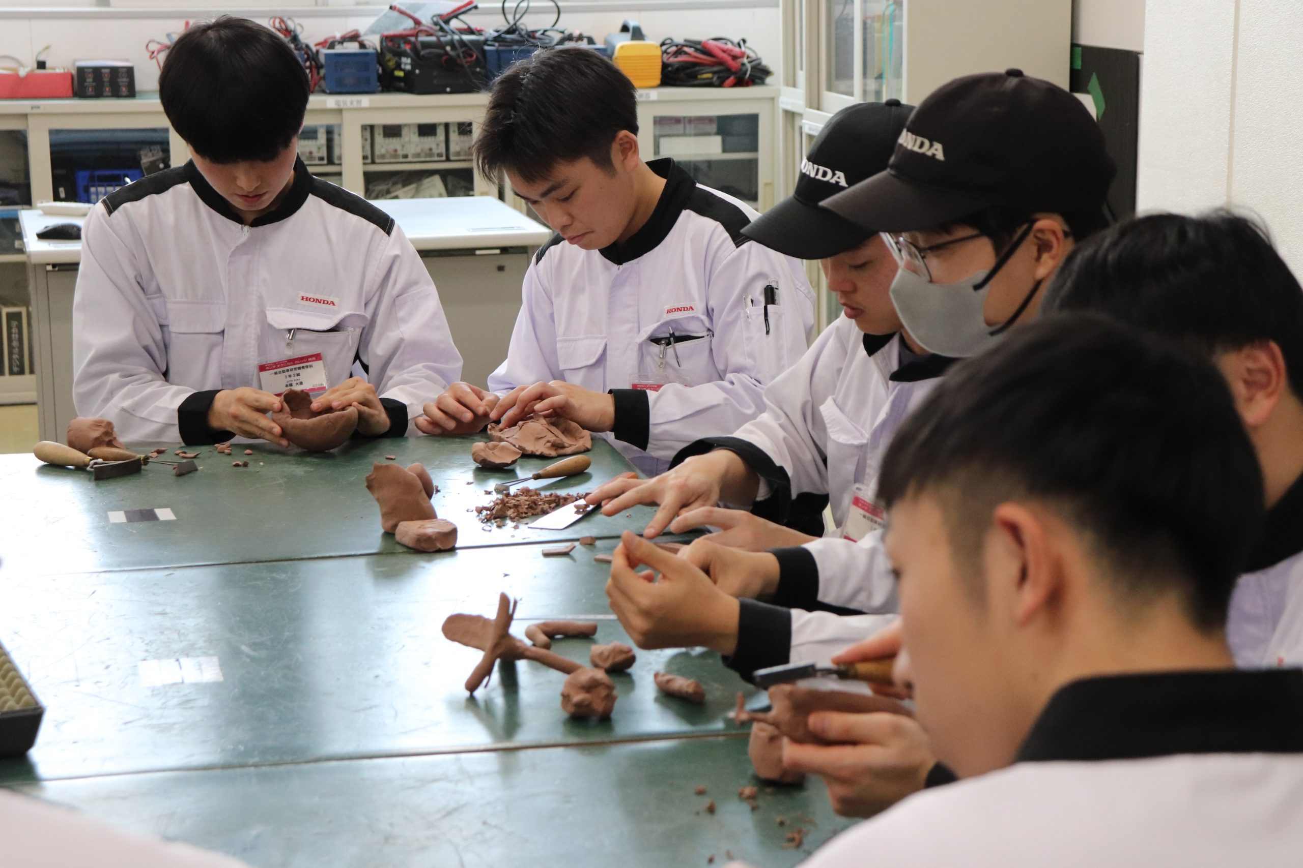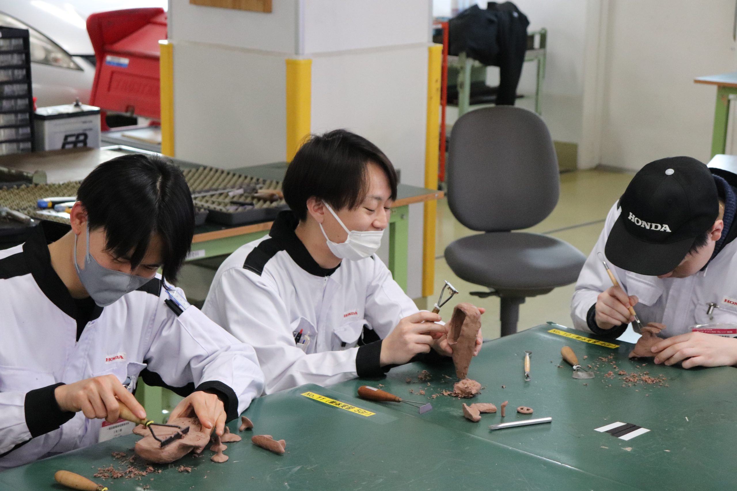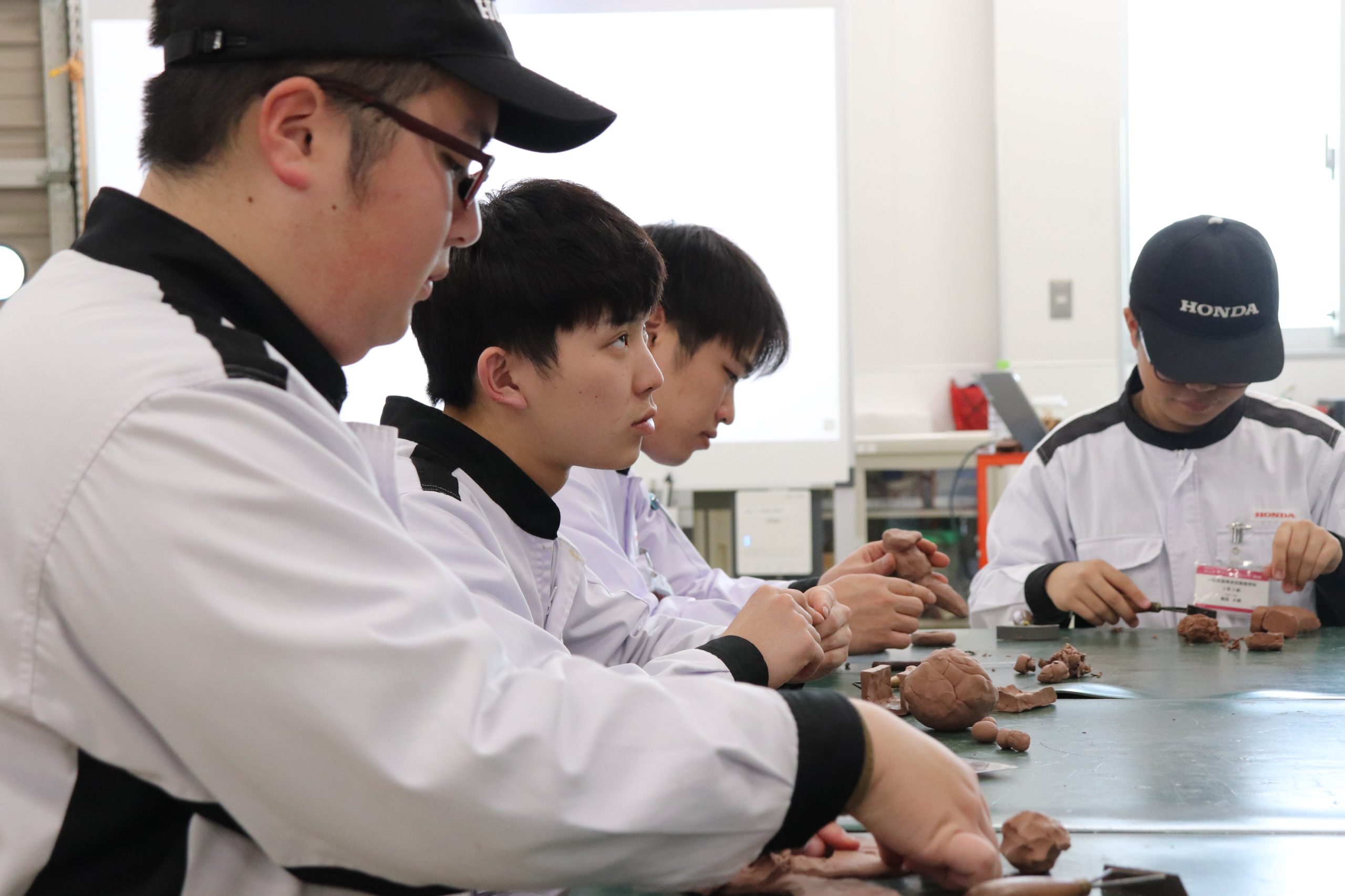 デザイン講話では、Hondaの製品作りにおいて、ゼロからモノをつくる発想が必要なこと、普遍性の追求や革新的なものの創造が必要であったりすること等、とても内容の濃い講義でした。また、クレイ(粘土)を使って、クルマのデザインモデル制作の実演、学園生への指導まで実施していただき、とても充実した実習になりました。