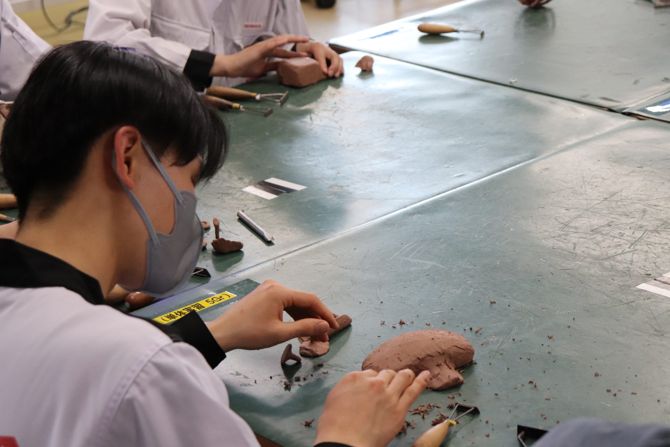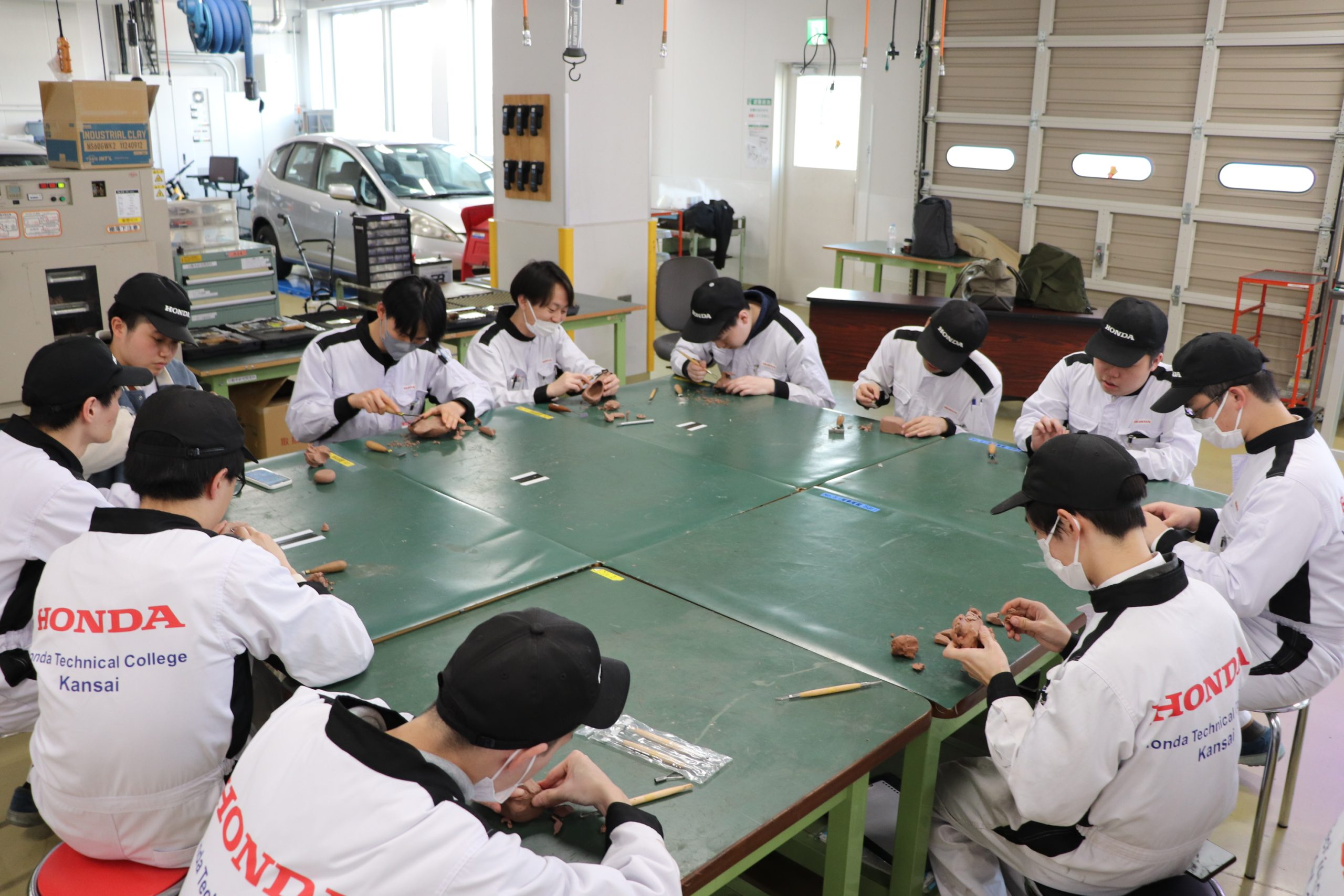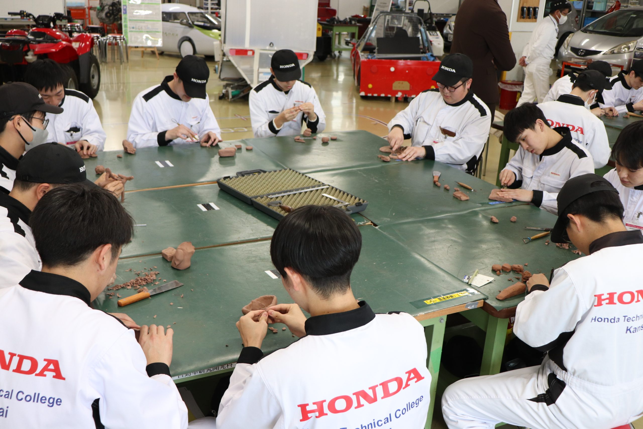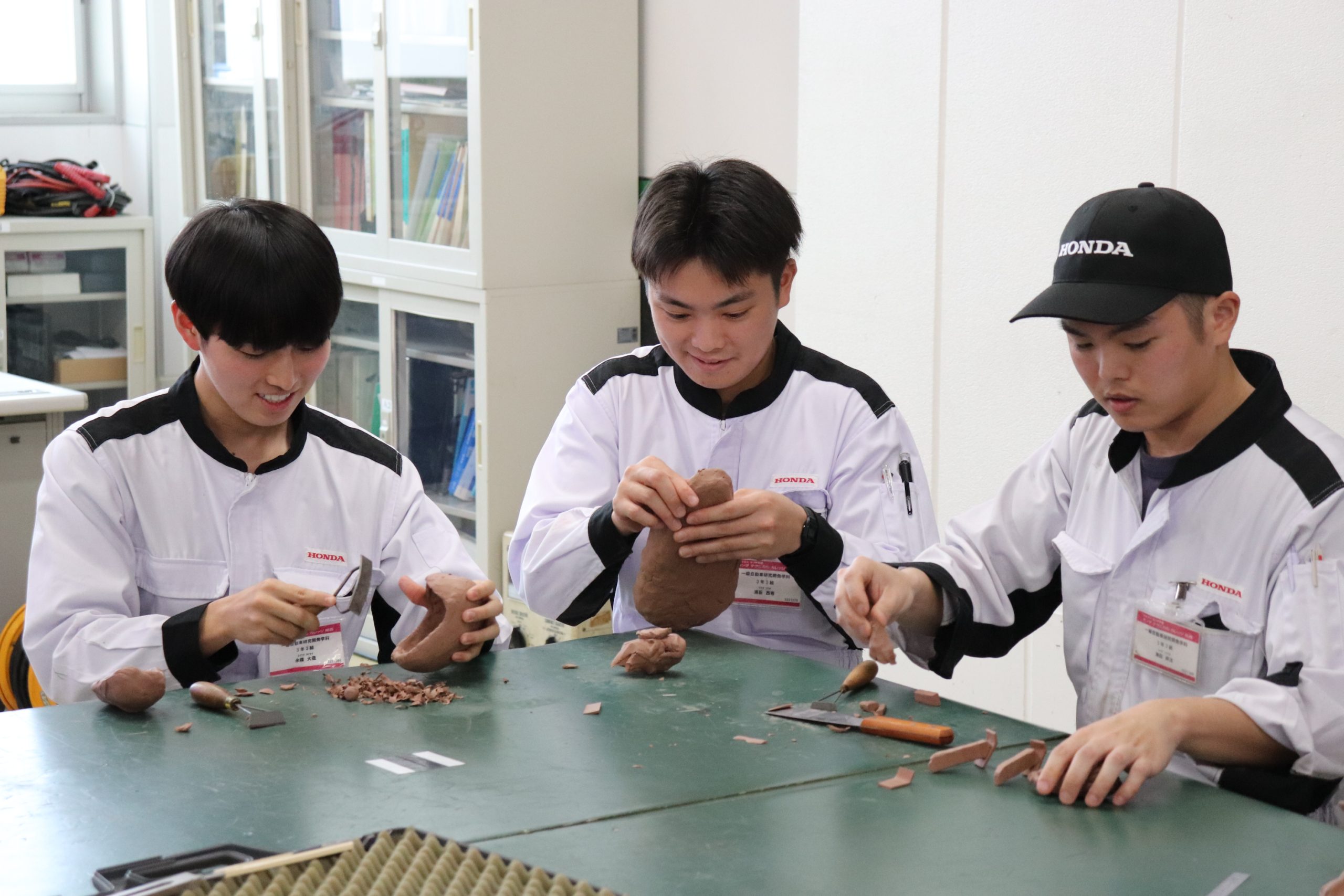 デザイン講話では、Hondaの製品作りにおいて、ゼロからモノをつくる発想が必要なこと、普遍性の追求や革新的なものの創造が必要であったりすること等、とても内容の濃い講義でした。また、クレイ(粘土)を使って、クルマのデザインモデル制作の実演、学園生への指導まで実施していただき、とても充実した実習になりました。