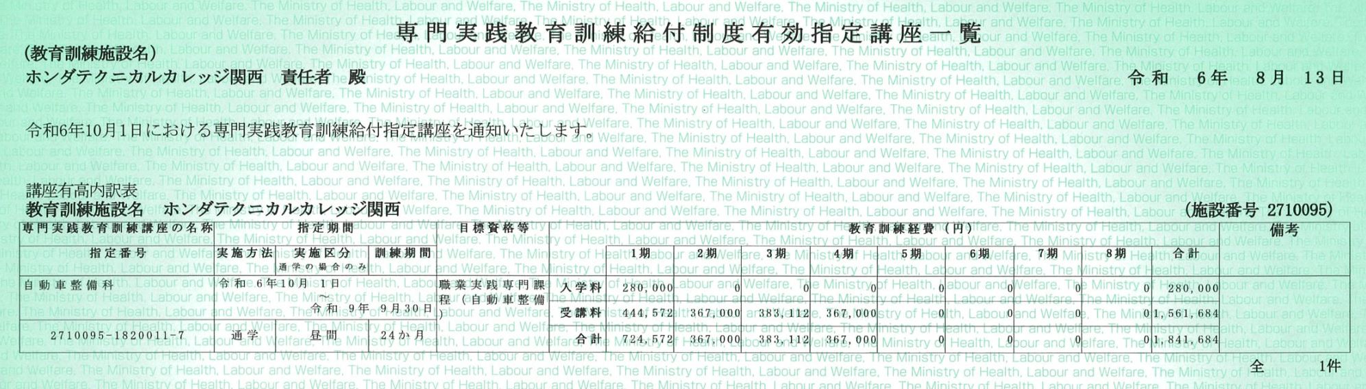 厚生労働省より自動車整備科(2年課程)が、教育訓練給付金の対象となる「専門実践教育給付金指定講座」に認定されております。また、2024年10月1日以降に講座の受講開始をされる方が支給額も拡充されました。