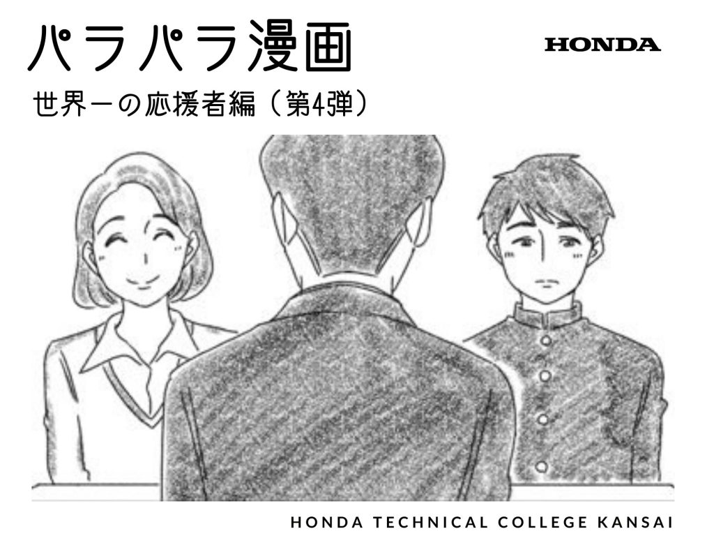 ホンダテクニカルカレッジ関西のパラパラ漫画ムービー第4弾「世界一の応援者」編が2022年3月に公開予定です。第1~3弾のパラパラ漫画の主人公は男女の学生でしたが、今回の主人公は子供の進学先を本気で悩み・心配する母親。子供の夢や目標を理解し、それを支える物語になってます。