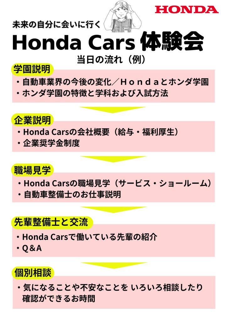 自動車が好きだったり、自動車ディーラー・自動車整備士のお仕事に興味関心があれば、職場・職業について理解が深められるイベントです。また、高校卒業後に自動車専門学校へ通うにあたり、Hondaの自動車大学校の学校説明はもちろんのこと、Honda Cars(企業)独自の奨学金で、進学時の負担を抑えることができる制度を知り、自身の夢(自動車整備士)を叶えるための進学方法を具体的にすることができます。
