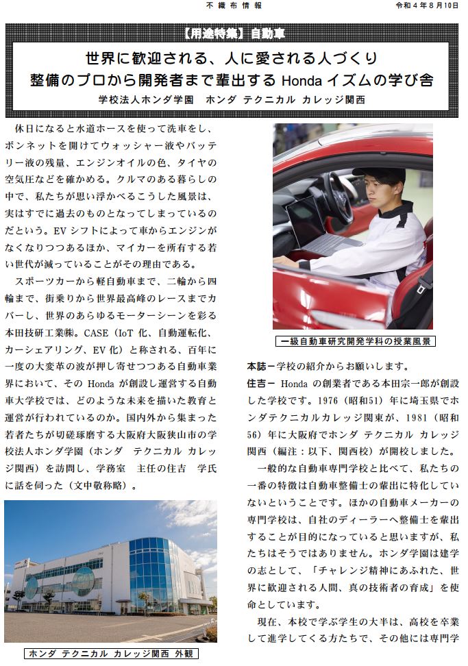 【取材(^^♪】専門誌へのホンダテクニカルカレッジ関西の取り上げ 2022.08.22 先日、業界専門誌(不織布業界の専門雑誌)の取材を受け、8月号に自動車業界特集ということで、自動車専門学校として唯一、ホンダテクニカルカレッジ関西の記事を掲載していただけることになりました。(#^^#) 記事の内容は、下図をクリックするとPDFで閲覧することができます。 世界に歓迎される人間を育成する。ホンダ学園の建学の精神です。