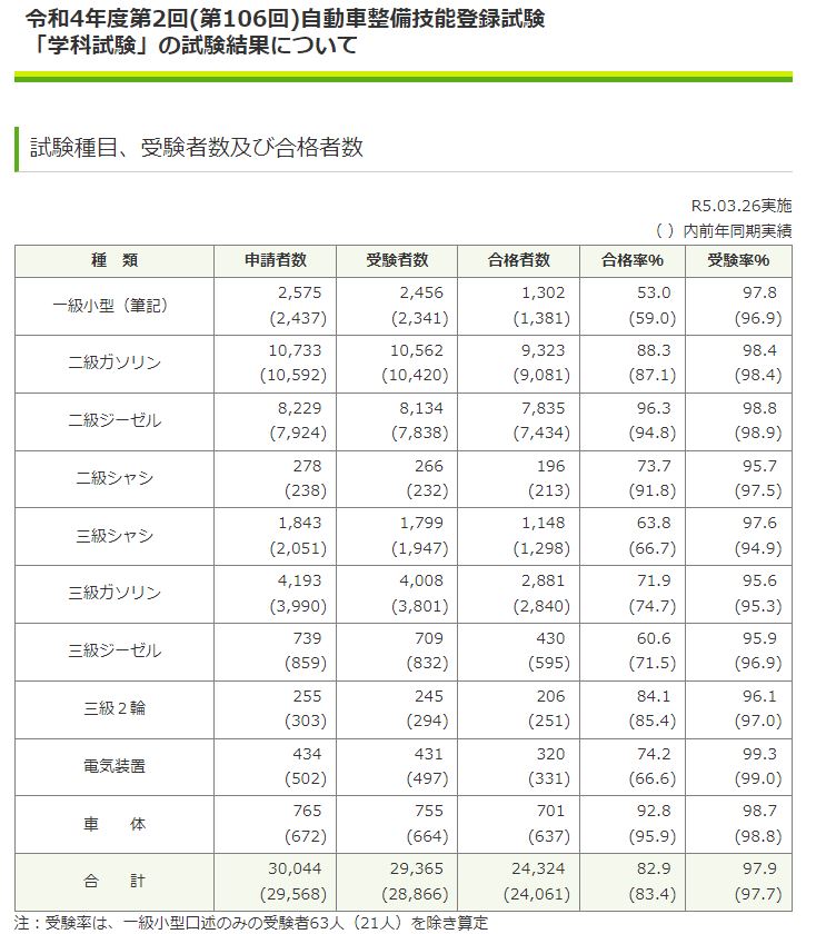 ■令和4年度 第2回「自動車整備技能登録試験(国家資格の自動車整備士資格試験)」の筆記試験結果 ※2023年4月11日発表
