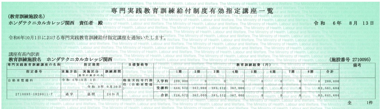 ホンダテクニカルカレッジ関西校の自動車整備科(2年課程)は、厚生労働省より教育訓練給付金の対象となる「専門実践教育給付金指定講座」に認定されております。社会人の方・社会人だった方の学び直しに、国(ハローワーク)が支援してくれる制度です。自動車業界で活躍してみたい方は、ぜひこの制度を利用してホンダ学園で二級自動車整備士資格を取得しませんか。
