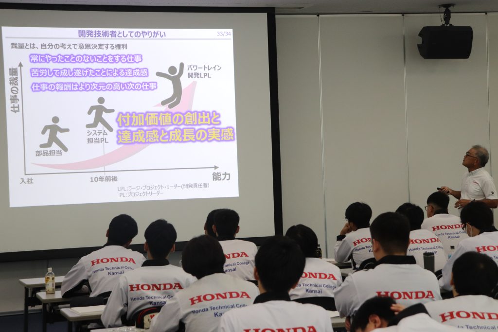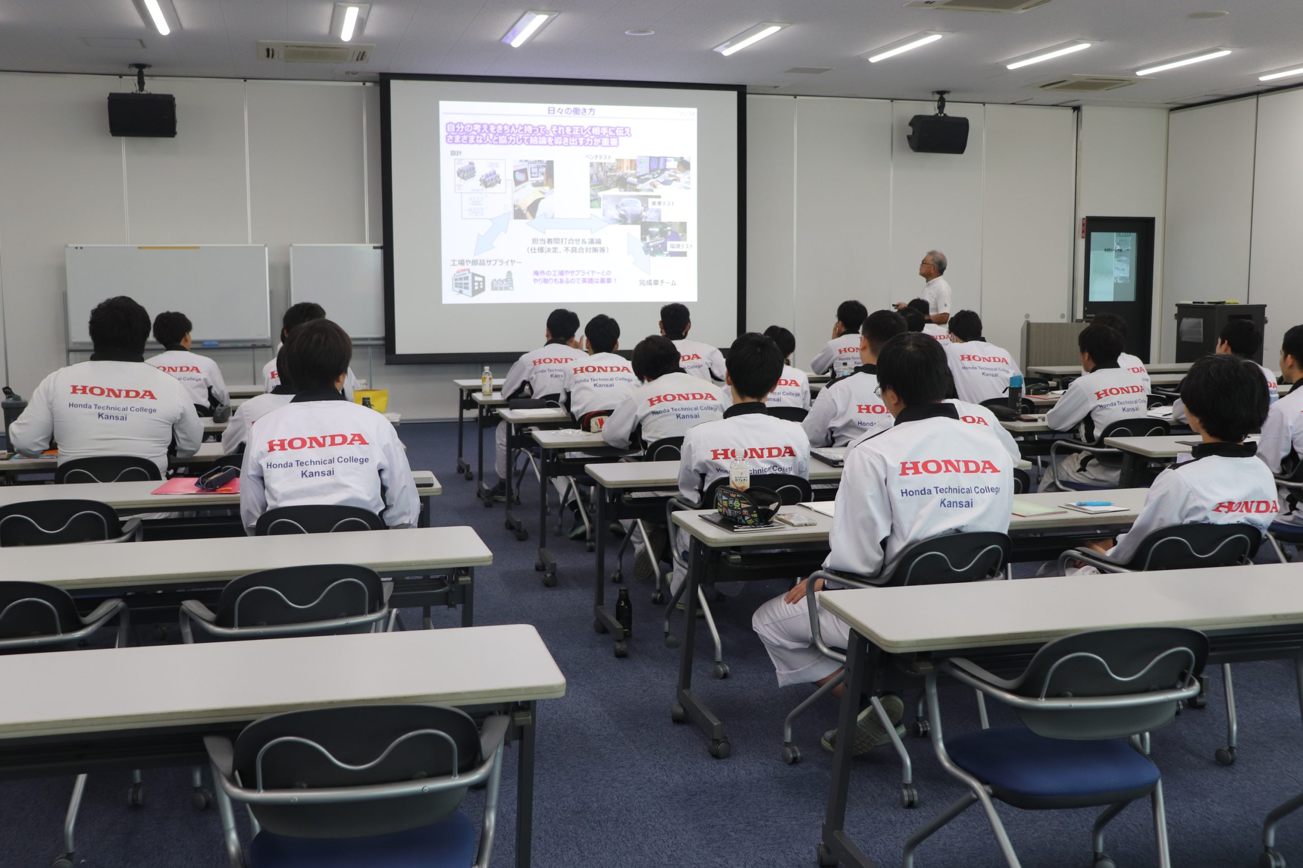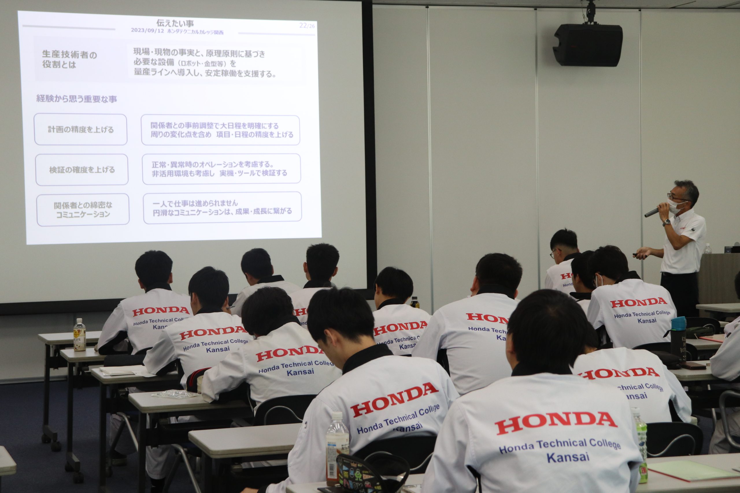 【講義】Hondaから講師を御招きし“ものづくりの神髄”を学びました 2023.09.14 9月12日(火)に一級自動車研究開発学科 自動車研究開発コース3年生が、Hondaのモノづくりの現場で活躍していた講師から貴重なお話を聞かせて頂きました。講義では、それぞれの講師の方が実際に携わった業務内容に苦労したこと、開発者のやりがい等をお話しいただき、最期に質疑・応答を実施しました。 今回の講義では、ものづくりの奥深さや幅広さを学び、また、さまざまな活躍できる職場に職種があることも知ることもできました。 講師の皆様、この度は出張講義の開催にご協力、誠にありがとうございました。