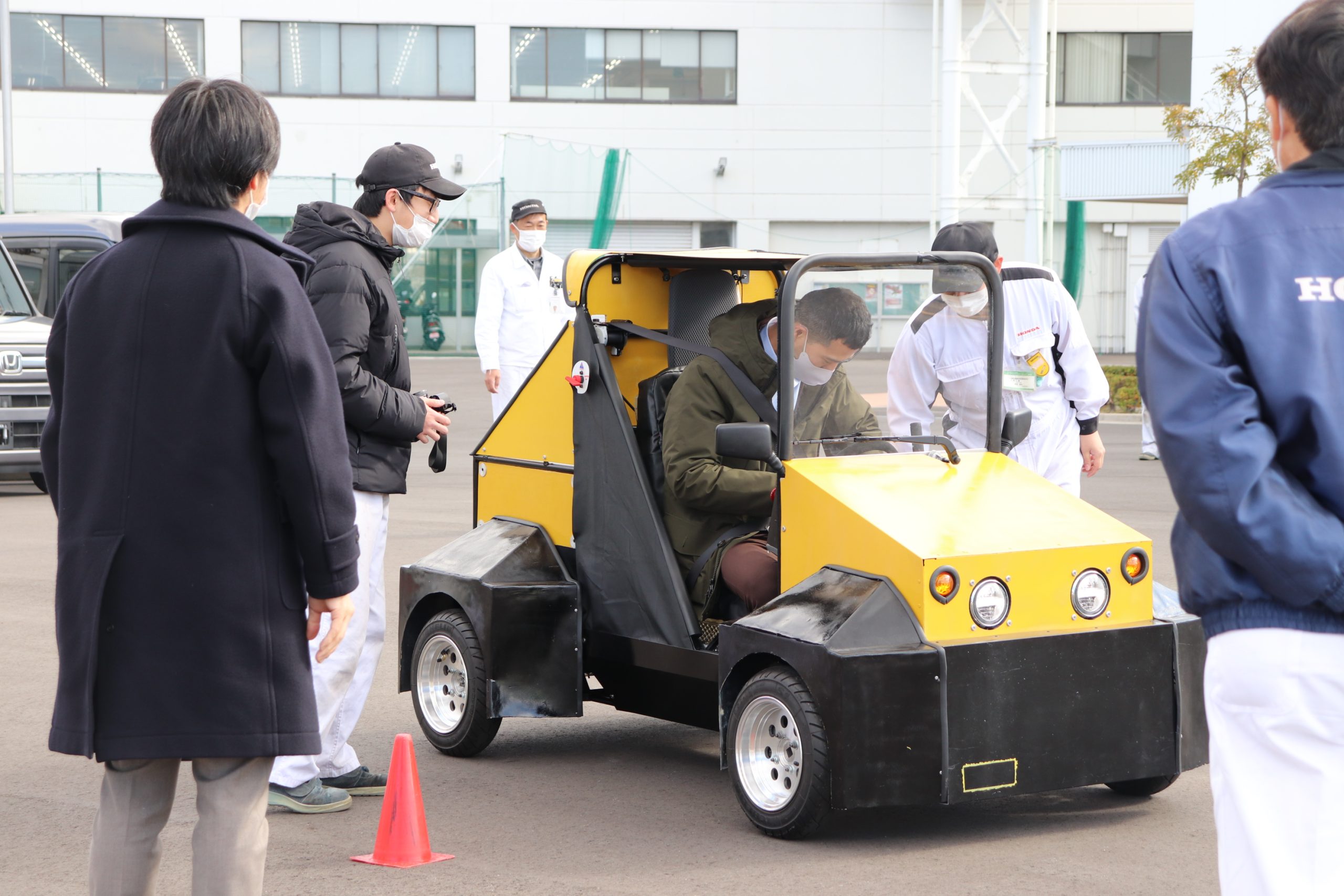 講義後は、自動車研究開発コース4年生が制作したクルマを実際に見て・乗っていただき、講評もしていただきました。