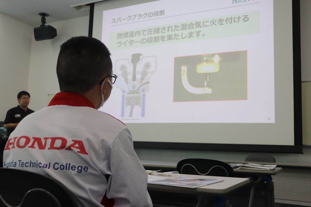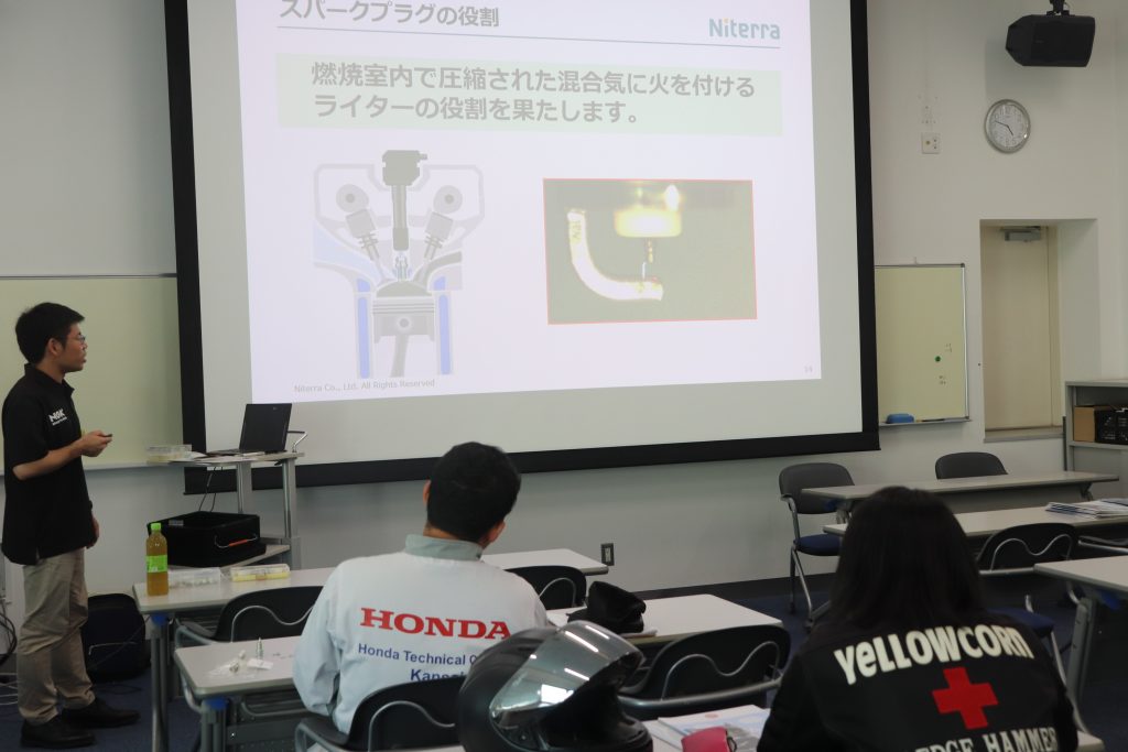 【講話】NGKスパーク プラグ技術講話 2023.08.30 8月29日(火)の放課後に外部から講師をお招きして、「スパークプラグ技術講話」を実施しました。講話は、教科書では学べないスパークプラグの技術的な内容(初心者向けの①プラグ基礎講座、同好会でのレース活動や研究開発の勉強をしている学生向け➁レース特別講座の2本)ということで、放課後の開催にも関わらず、熱心な学生が参加し、聴講をしていました。 この度は、講話にご協力いただきました日本特殊陶業株式会社様、ありがとうございました。