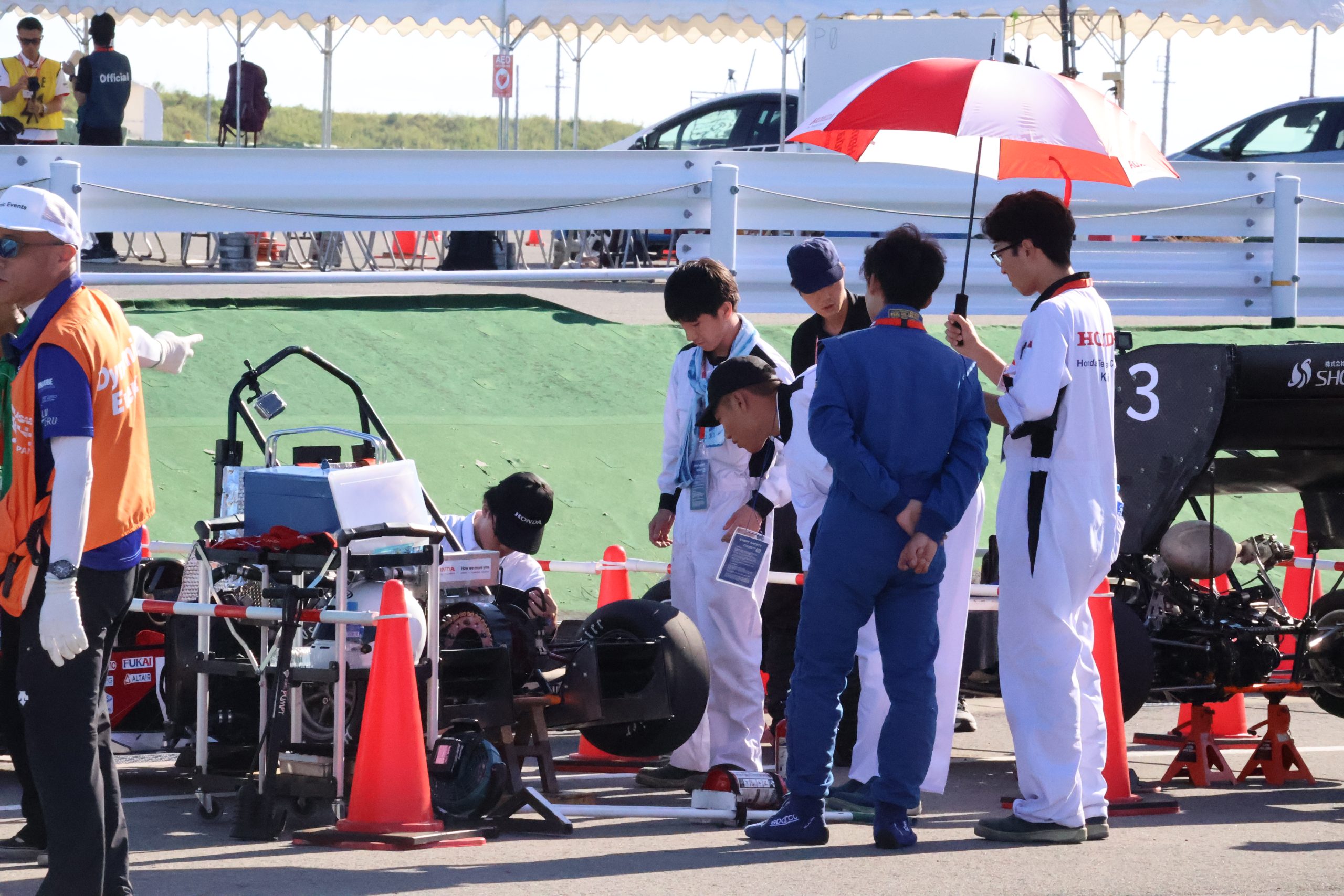 全日本学生フォーミュラ※1の日本大会の車検2日目です。昨日、通らなかった静的車検は車検2日目の朝一で合格し、その後行われた動的確認(チルトテスト・騒音テスト・ブレーキテスト)はいずれも一発合格で午前中には終了しました。午後は、プラクティスエリアで出場予定のチーム・ドライバー全員による練習走行を行いました。若干のトラブル(ブレーキランプのLED切れ)はありましたが、すぐに交換を行い問題なく走行ができました。翌日は、いよいよ動的審査になります。引き続き、応援よろしくお願いします。