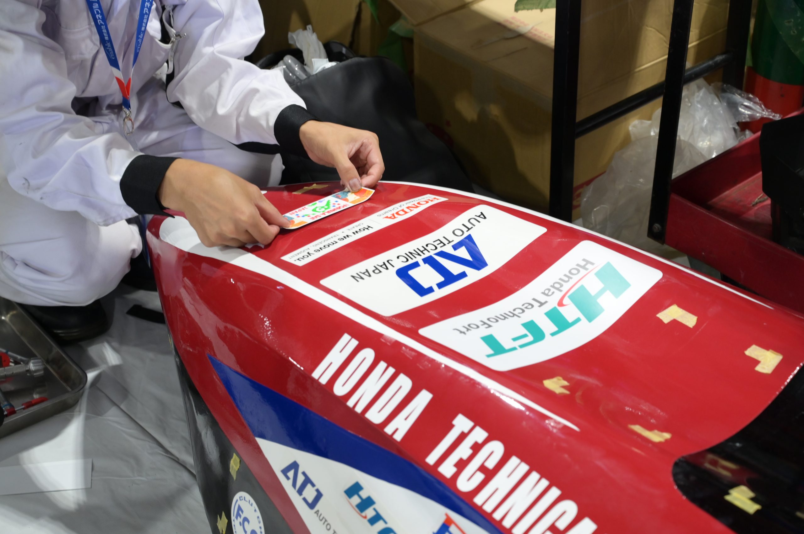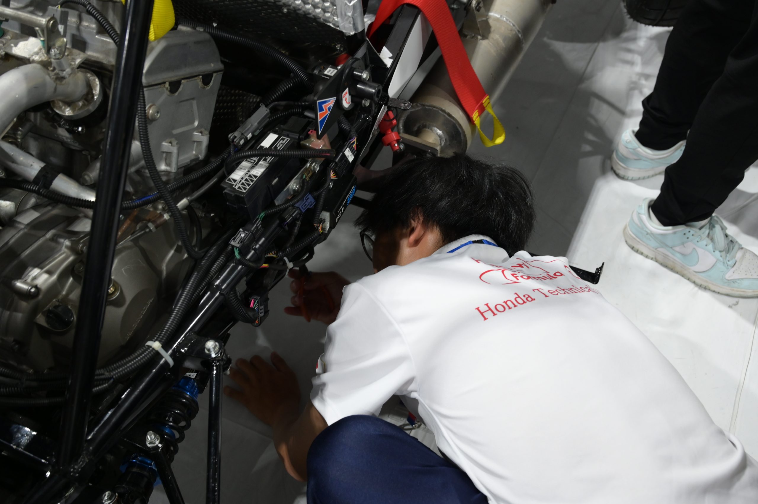 会場についてすぐにピットの設営を行い、その後、車両の静的車検を受けました。車検での指摘項目は昨年より厳しく、他チーム含めて小傷のあるマグネシウムホイールについては、ほぼ使用不可となりました。