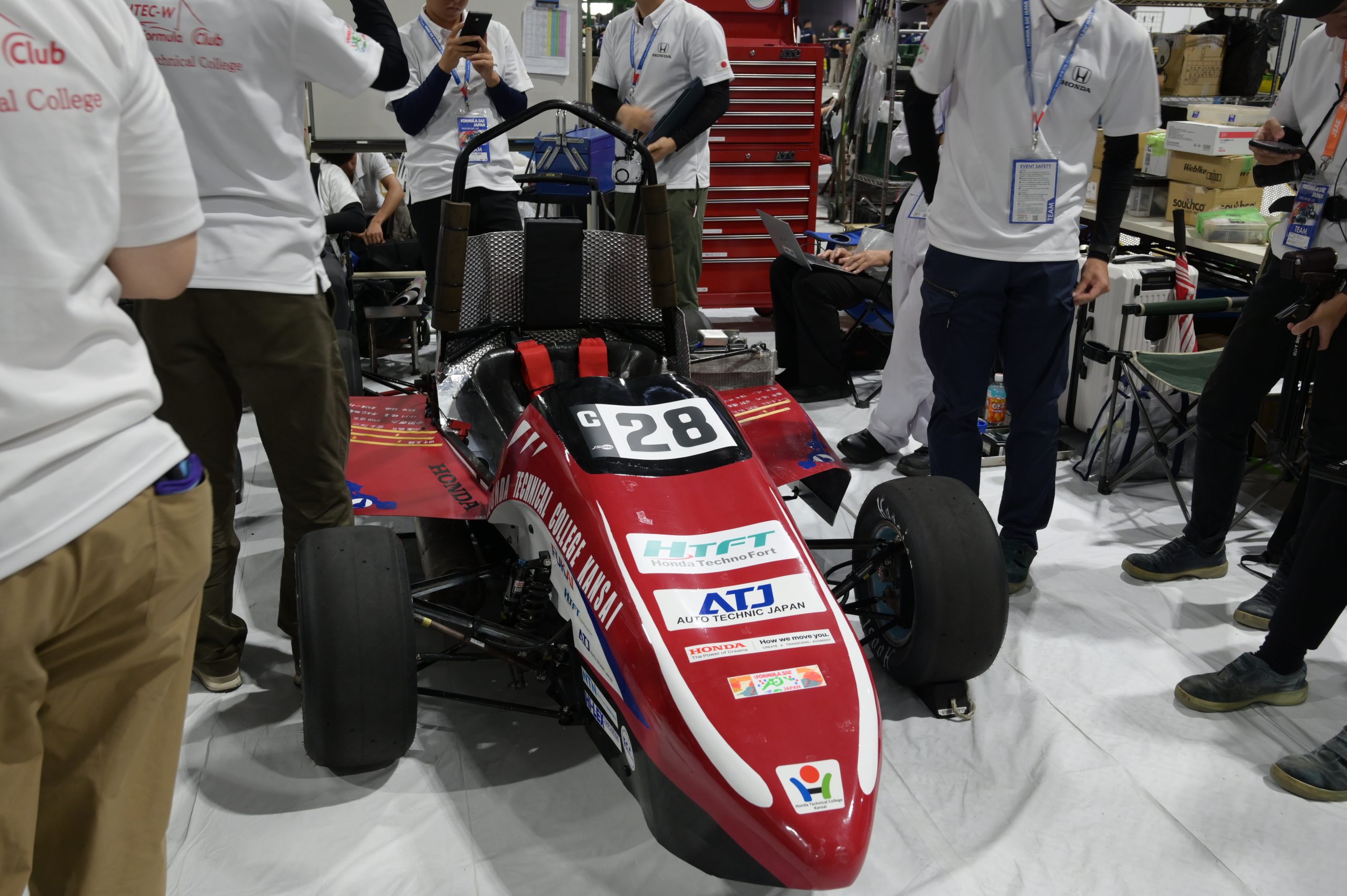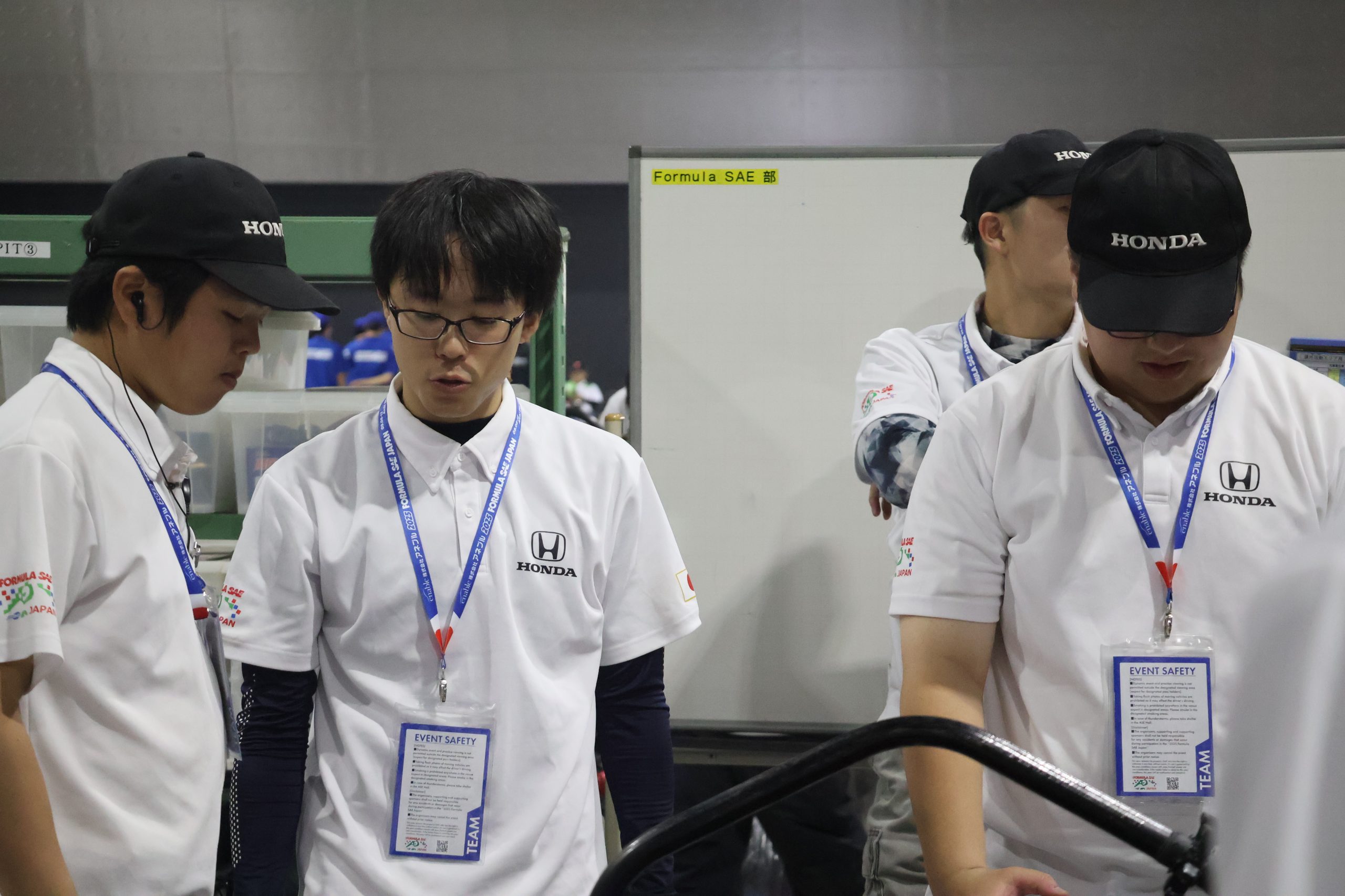 7時にピットがオープンし、午前中にデザイン審査・コスト審査・静的車検の残項目再車検をし、全項目合格しました。午後からは、ドライバー試験(登録ドライバー全員合格)・重量測定・チルト試験(60度傾きNG→車高調整後再試験で合格)、暖気エリアで暖気後に騒音試験(合格)、プレゼン審査、ブレーキテスト(合格)等、数々の審査・試験を実施しました。その後ドライバーミーティングが行われ、ピットがクローズとなりました。本日の車検では、63台中、25台の合格となりました。明日は、いよいよ動的審査となります。