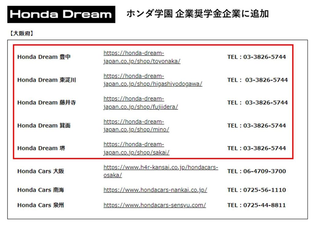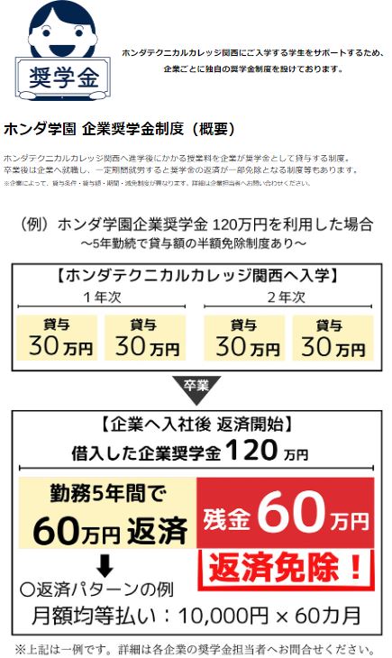 ホンダテクニカルカレッジ関西にご入学する学生をサポートするため、Hondaの四輪販売店(Honda Cars)と二輪販売店(Honda Dream)では、企業独自の奨学金制度を設けております。今回は、二輪販売店(Honda Dream)の株式会社ホンダドリームジャパン様(拠点数:全国60拠点)が新たに追加になりましたのでお知らせします。制度の概要および参画企業は下記よりご確認できます。