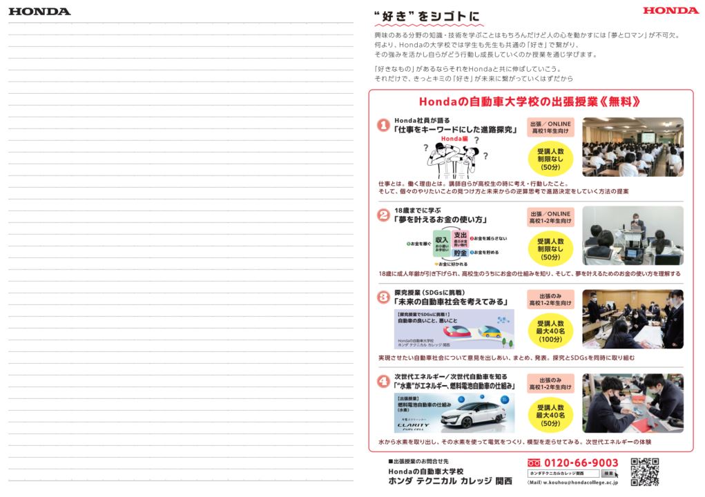 ホンダ テクニカル カレッジ 関西は、高校生が将来就きたい職業を考えるキッカケとして、進路探究ができるオリジナルのキャンパスノート『進路探究ノート』を大阪府・京都府・兵庫県の高校1年生15,000人※に、2023年5月8日より無料配布します。※配布先は事前に連絡を取り、配布許可が取れた一部高等学校となります。