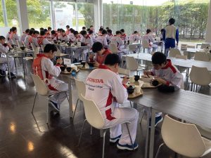 入学したばかりの1年生および自動車整備留学生科2年生が、4月22日(月)~23日(火)の二日間、三重県の鈴鹿市へ校外オリエンテーションに出かけてきました。4月22日の朝8時にバスでホンダ学園を出発し鈴鹿サーキット移動後、2グループに分かれ、午後からはレーシングコースと鈴鹿製作所の見学および交通教育センターでのモビリティ体験と危険予知トレーニングを実施しました。また、初日の夜は鈴鹿サーキットホテルに宿泊し、仲間とともに夕食・歓談を楽しみました。