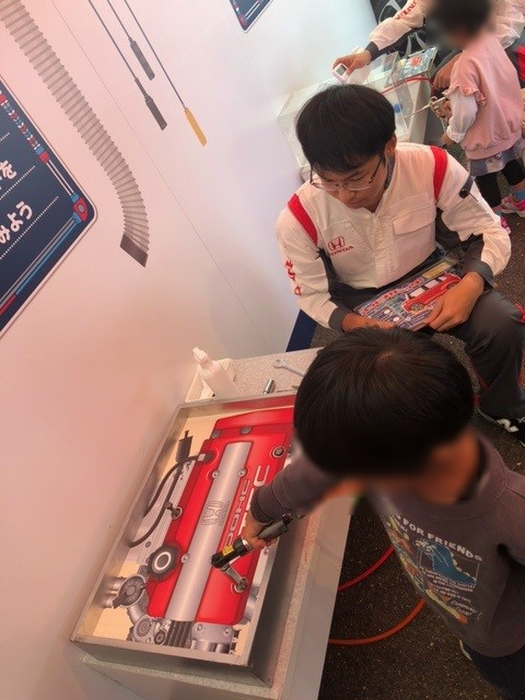 10月28日(土)、29日(日)の二日間、三重県の鈴鹿サーキットで開催された「Enjoy Honda」でお子様のメカニック体験サポートを学園生で実施しました。天候も良く、また、レースも併催であったことから、二日間で2万931人もの方が「Enjoy Honda」に訪れ、その内『KIDSメカニック体験』へ747組のお子様とご家族がご参加いただき、交流することができました。普段とは違うユニフォーム(Hondaの四輪販売店:Honda Carsさんの整備士ユニフォーム)を着たことも学園生にとっても新鮮だったみたいです。(#^^#)