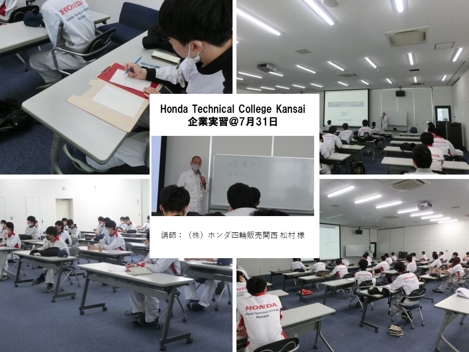 7月31日(金)に(株)ホンダ四輪販売関西様にお越しいただき、講話を実施していただきました。講話では、四輪販売店の職種にサービス領域の仕事・業務について詳しく説明があり、学生たちは真剣に聞き、メモを取っておりました。