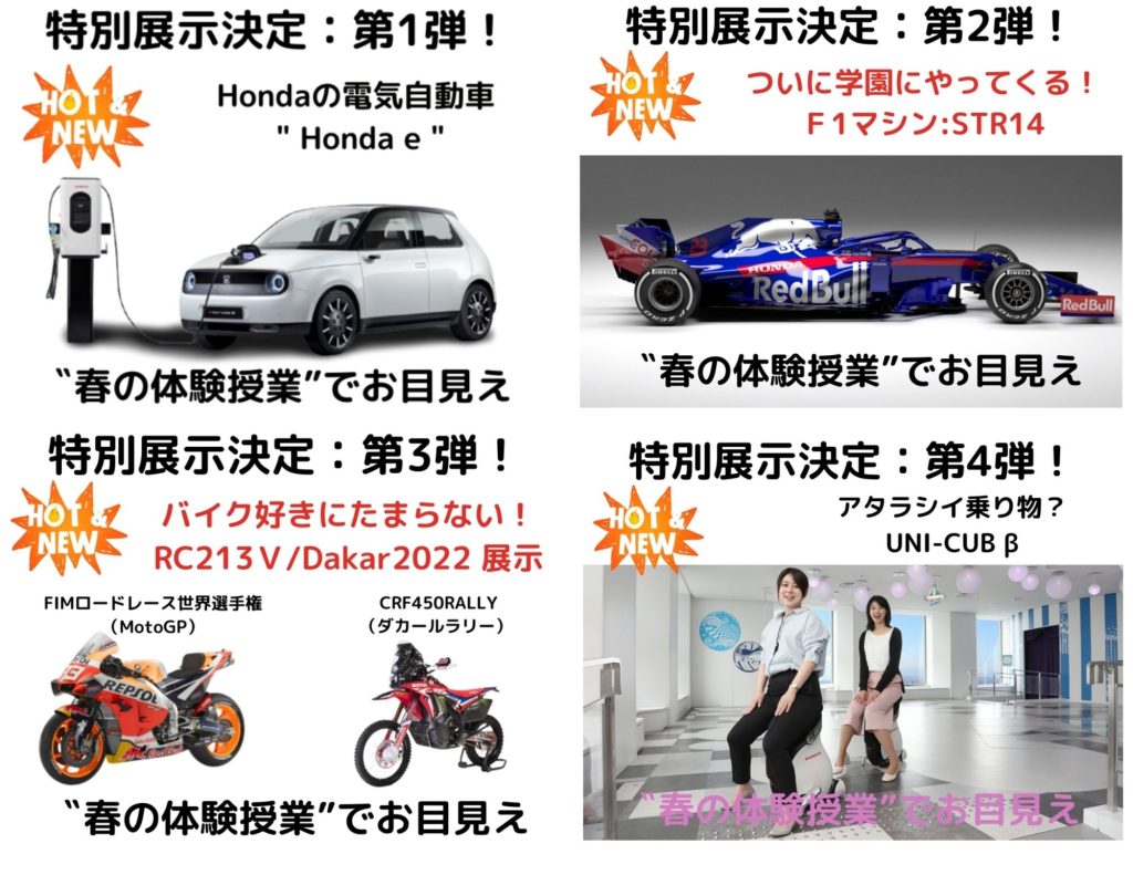 盛りだくさんの特別展示「F1マシン/MOTOGPマシン/UNI-CUB/Honda e(電気自動車)」に先生と在校生が教えてくれる選べる2つの体験授業「①自動車整備科体体験②一級自動車研究開発学科体験」!