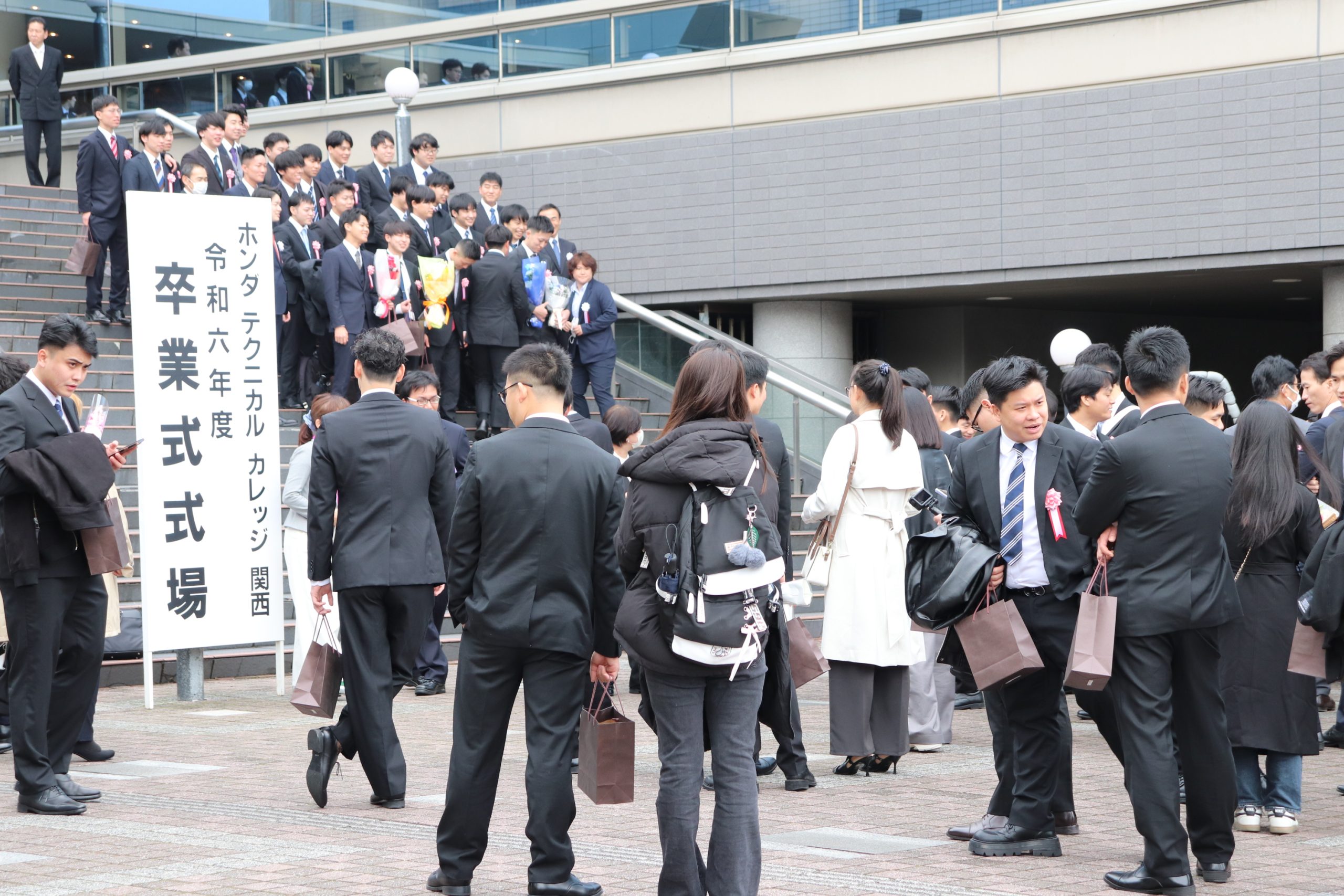 3月12日(水)に大阪狭山市にあるSAYAKAホールにて、令和6年度卒業式を執り行いました。卒業生は、自動車整備科54名、自動車整備留学生科34名、一級自動車研究開発学科53名、合計141名です。卒業式には、たくさんのご来賓、保護者様もご参列いただき、また式次第もコロナ前の状態にほぼ戻っております。その他、祝電ではサプライズで、Hondaのレーシングアンバサダーの方々からのビデオレターを放映し、卒業生・参列者、また、Youtubeで視聴していたご家族の皆様にも驚かれたものと思います。