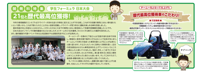自動車研究開発科(3年制)最後の卒業生となる14期生が取り組んだ学生フォーミュラへの挑戦についても掲載しています。