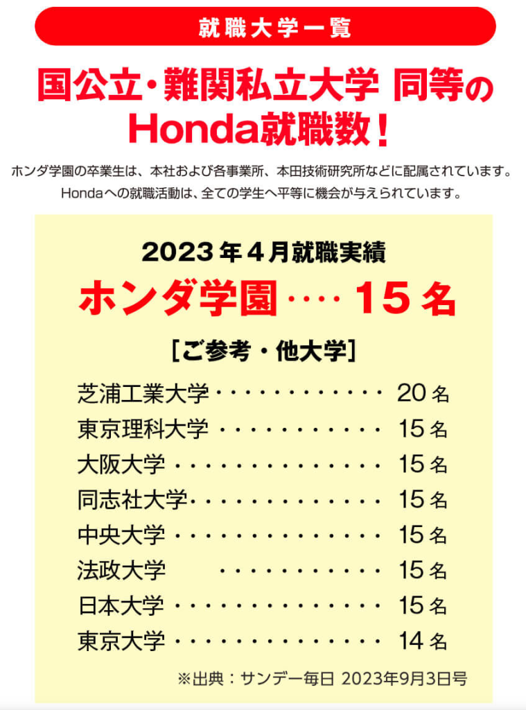 【Honda内定者情報】2023年4月 本田技研工業(株)への内定数(主要大学反映版) 2023.09.11 主要大学から2023年4月にHonda(本田技研工業株式会社)に内定した学生数が公表されました。ホンダ学園は、前年1位から2位(15名)へランキングを落としたものの、難関の国公立大・私立有名大学並みの就職内定実績でした。「Hondaに強いホンダ学園」は健在です! ※実績数値の出典:サンデー毎日9月3日号