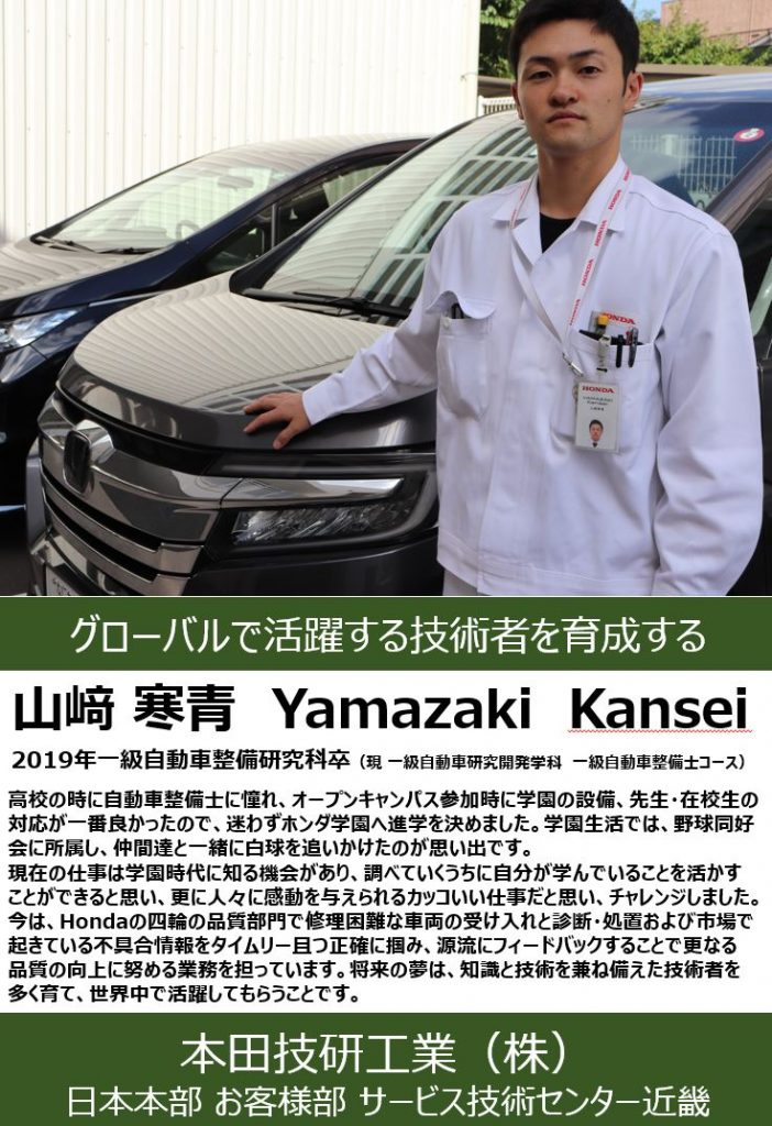 HPの就職・資格コーナーの卒業生紹介ページに、2019年に現:一級自動車研究開発学科 一級自動車整備士コースを卒業した「本田技研工業(株)日本本部お客様部 サービス技術センター」勤務の山﨑様の情報を追加しました。山﨑様は高い目標「世界で活躍するHondaの技術者を多く輩出すること」を持ち、現在の職場で知識・技術を磨いております。