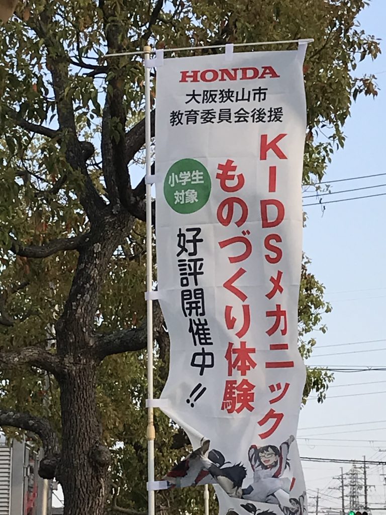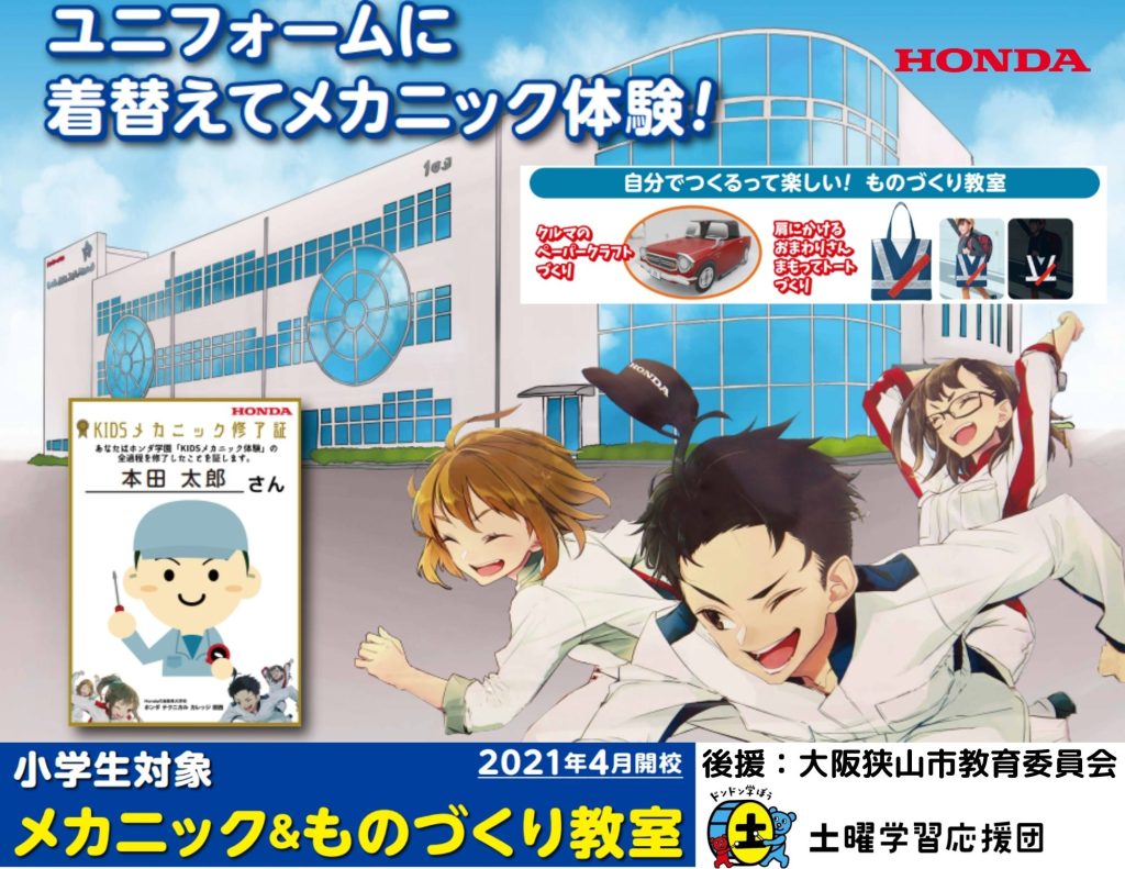 【New】KIDSメカニック&ものづくり教室の”のぼり”の設置 2022.04.11 昨年の4月に開校した『KIDSメカニック&ものづくり教室』の”のぼり”を、新たに学園の道路側に設置しました。特に宣伝等は実施していないのですが、いつもすぐに参加者が一杯になるイベントです。ただ、まだまだ地域の方への認知は不十分。大阪狭山市教育委員会の後援、更に文部科学省の土曜学習応援団に認定されている『KIDSメカニック&ものづくり教室』。参加できる対象者は小学生となります。地域にお住いの小学生の皆様、保護者の皆様、ご興味がありましたら、ぜひ、ご参加ください。 ■KIDSメカニック&ものづくり教室の詳細は下図をクリック