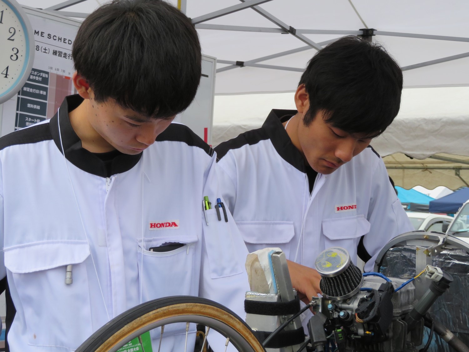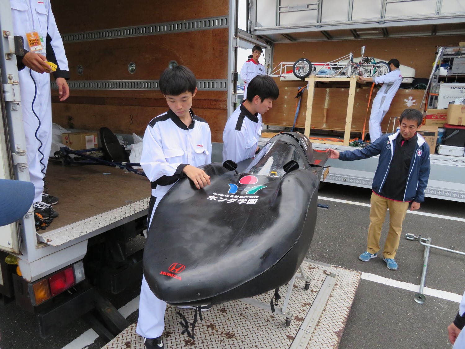 昨年までとは異なるエンジンと車体での出場を目指したことから、学内での準備に時間がかかり、大会前日の深夜まで宿泊施設の駐車場でも作業を行うという状況でしたが、なんとかツインリンクもてぎでのテスト走行に間に合わせることが出来ました。